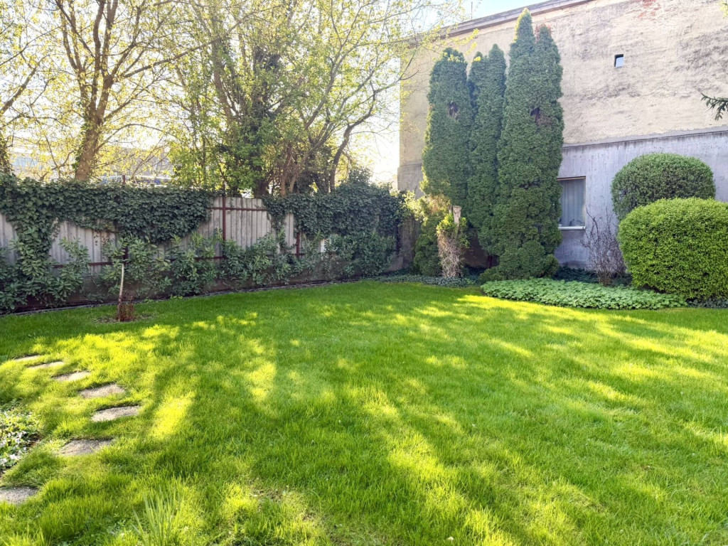 Az ingatlanhoz tartozó 550 m²-es telek igazi zöld oázis a belváros közepén: parkosított kert, különleges növények és automata locsolórendszer gondoskodik a mindig ápolt, esztétikus környezetről.