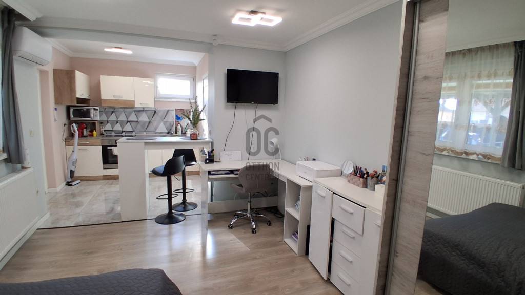 Külön bejáratú lakóegység: szoba–konyha egy légtérben, saját zuhanyzós WC-vel