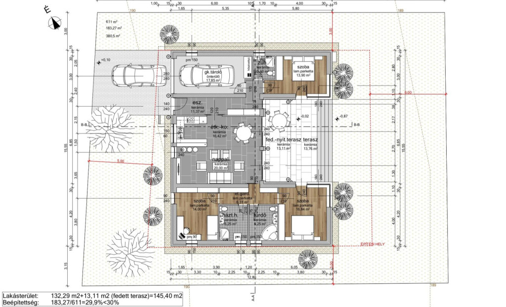 A ház tájolása és elhelyezése biztosítja a megfelelő benapozást és a privát kert használatát.