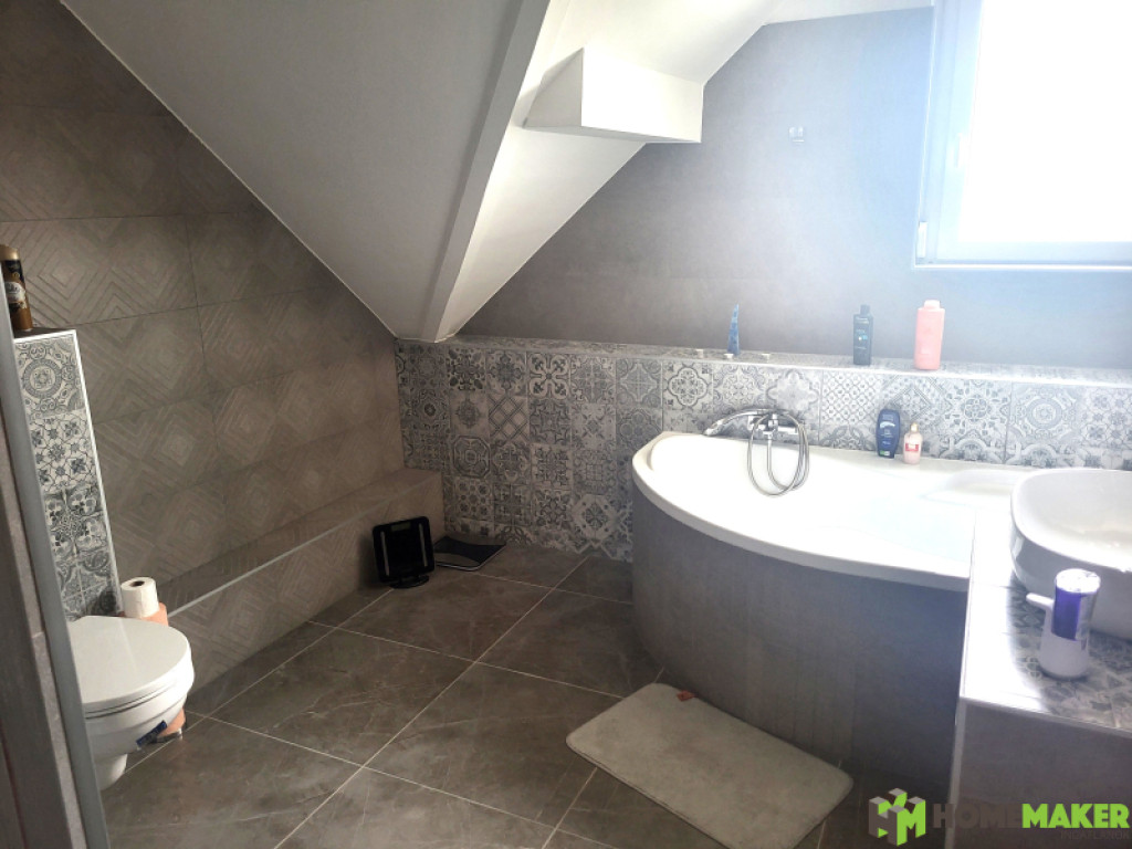 - a felső szinten a két hálószoba mellett hatalmas, sarokkáddal és zuhanyzóval berendezett fürdőszoba kapott helyet