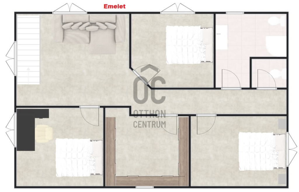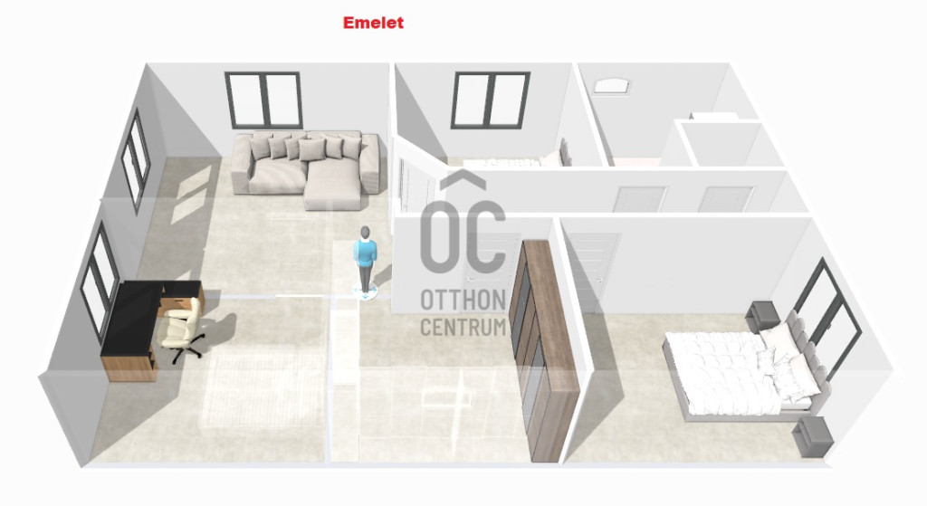 Az emeletre kényelmes lépcső vezet fel, ahol három hálószoba, gardrób, fürdőszoba és külön WC került kialakításra. Egy kisebb teakonyha is helyet kapott ezen a szinten, ami ideálissá teszi az ingatlant kétgenerációs otthonként való használatra is. A tetőtéri szobák mindegyikéből lenyűgöző panoráma nyílik a Dunára, így a természet közelségét minden évszakban élvezhetjük.