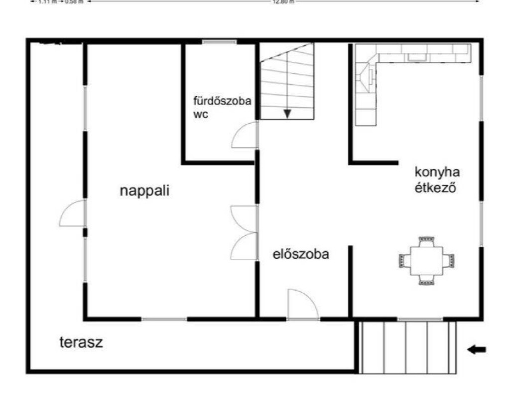 Az első szintre fedett teraszon át jutunk.Előszobából balra nappaliba, jobbra pedig tágas,világos étkezős konyhába érkezünk.