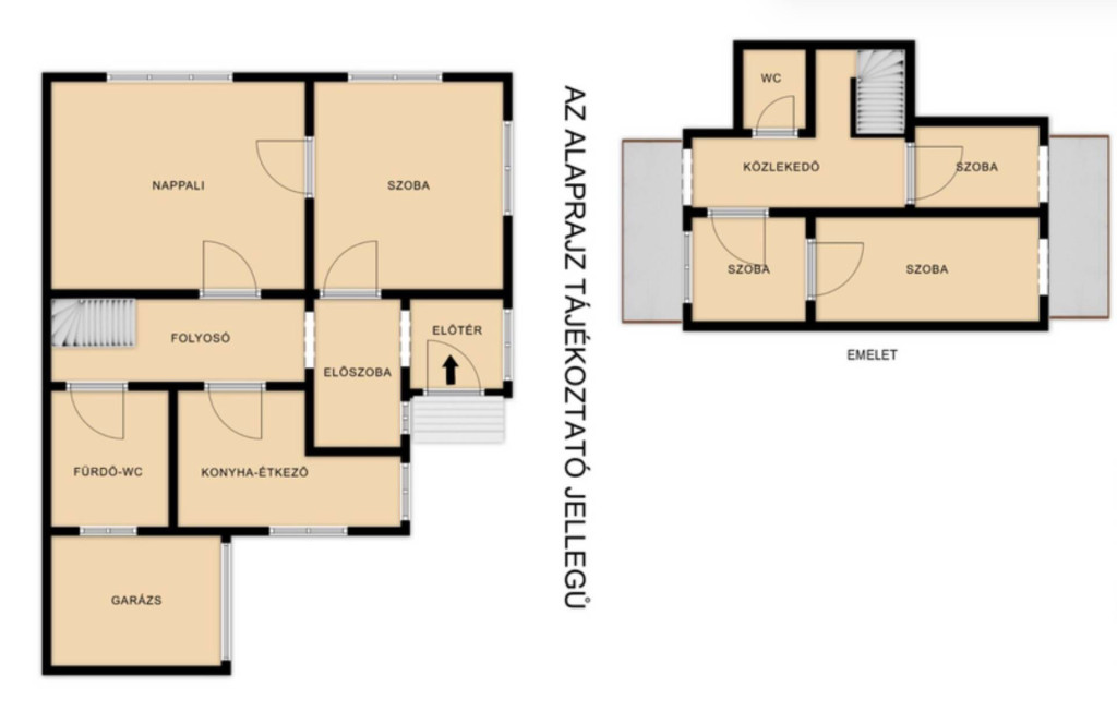 Földszinten, előtér, előszoba, közlekedő, tágas nappali, szoba, konyha–étkezővel, újszerű fürdőszoba WC.