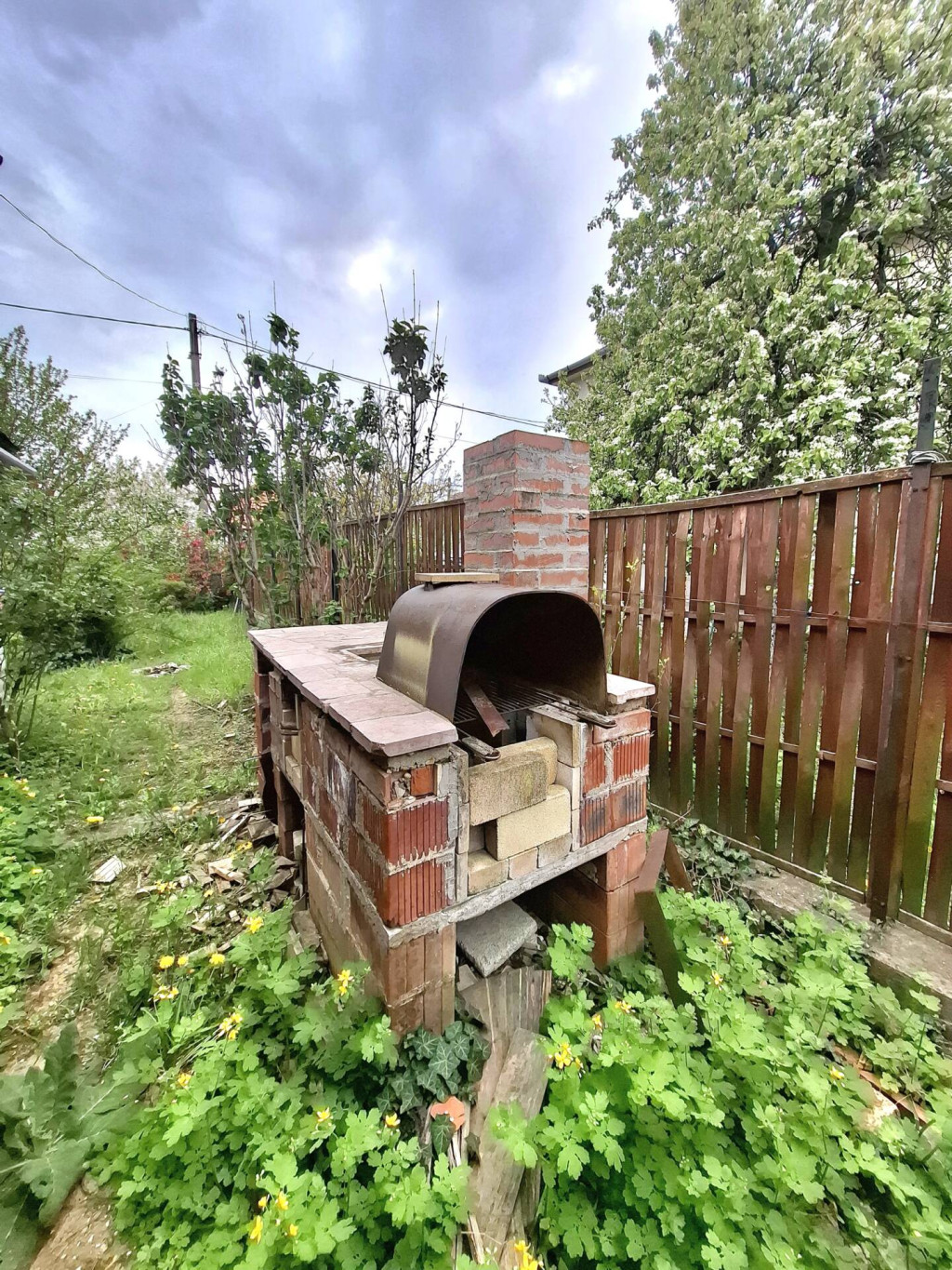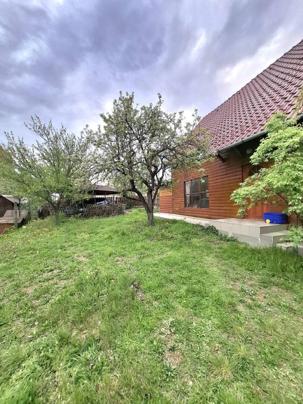 Gyümölcsfákkal beültetett füvesített.Van egy nagy fedett kocsi beálló is.
