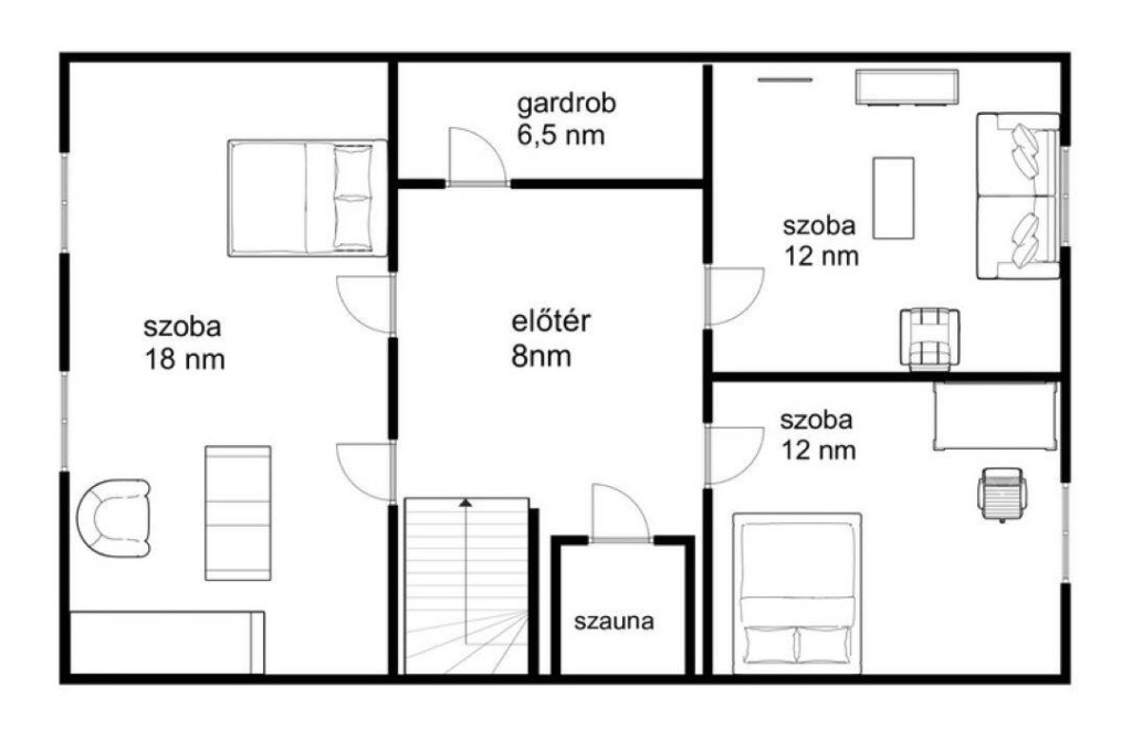 Az emelet teljes mértékben a remek elrendezést tükrözi. Három szoba, az egyik könnyen megfelezhető így akár négy szobás is lehet.Itt még egy gardrob szoba lett kialakítva, amely megkönnyíti a nagy családok életét.