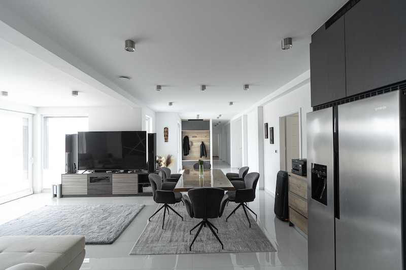 At the heart of the house is a spacious 61 m² living room–kitchen–dining area, which connects directly to a 21 m² covered terrace and a 70 m² panoramic sun terrace.