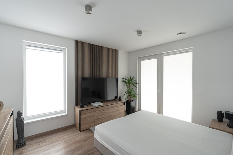 A nyílászárók elektromos alumínium redőnyökkel, szúnyoghálóval és pliszé árnyékolókkal felszereltek.