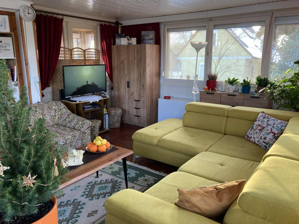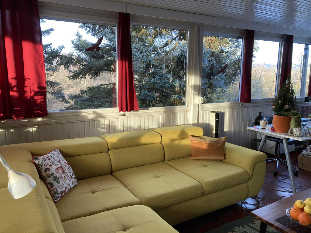 A felső szinten az egy légterű lakótér csendes és otthonos, az étkező-nappali panoráma jellegű, hőszigetelt ablakai egész nap világos, tágas térérzetet biztosítanak. A nappaliból gyönyörű kilátás nyílik a hegyekre és a zöld kertre. Egész nap csend és nyugalom várja leendő tulajdonosát. Itt található egy félszoba kinyitható kétszemélyes kanapéval, IKEA-s ruhásszekrénnyel. Mindkét szinten önálló zuhanyzós fürdőszoba WC-vel.