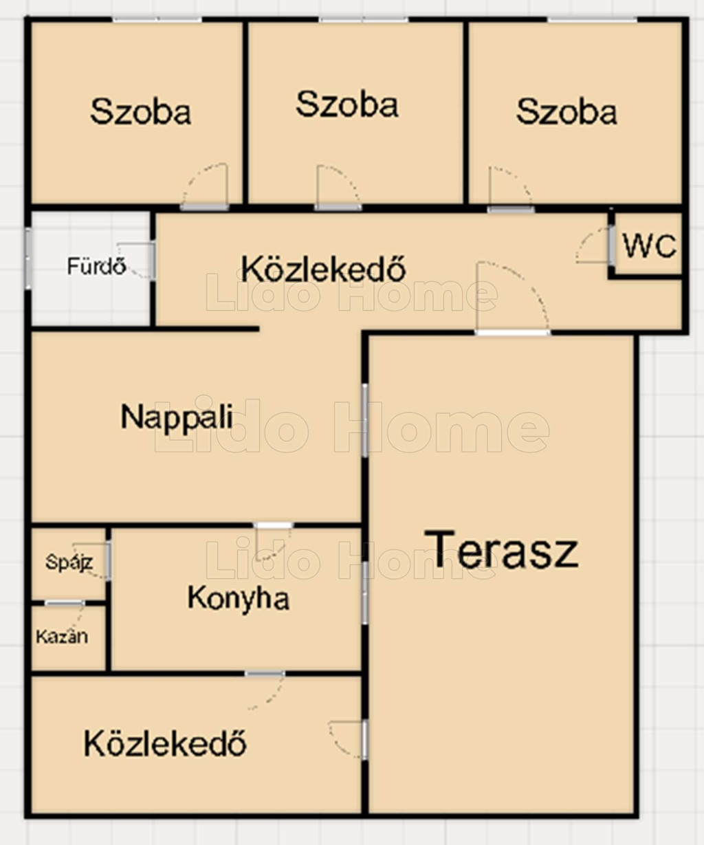Az ingatlan elrendezése 3 szoba, nappali, konyha, spájz, fürdőszoba + WC, terasz.