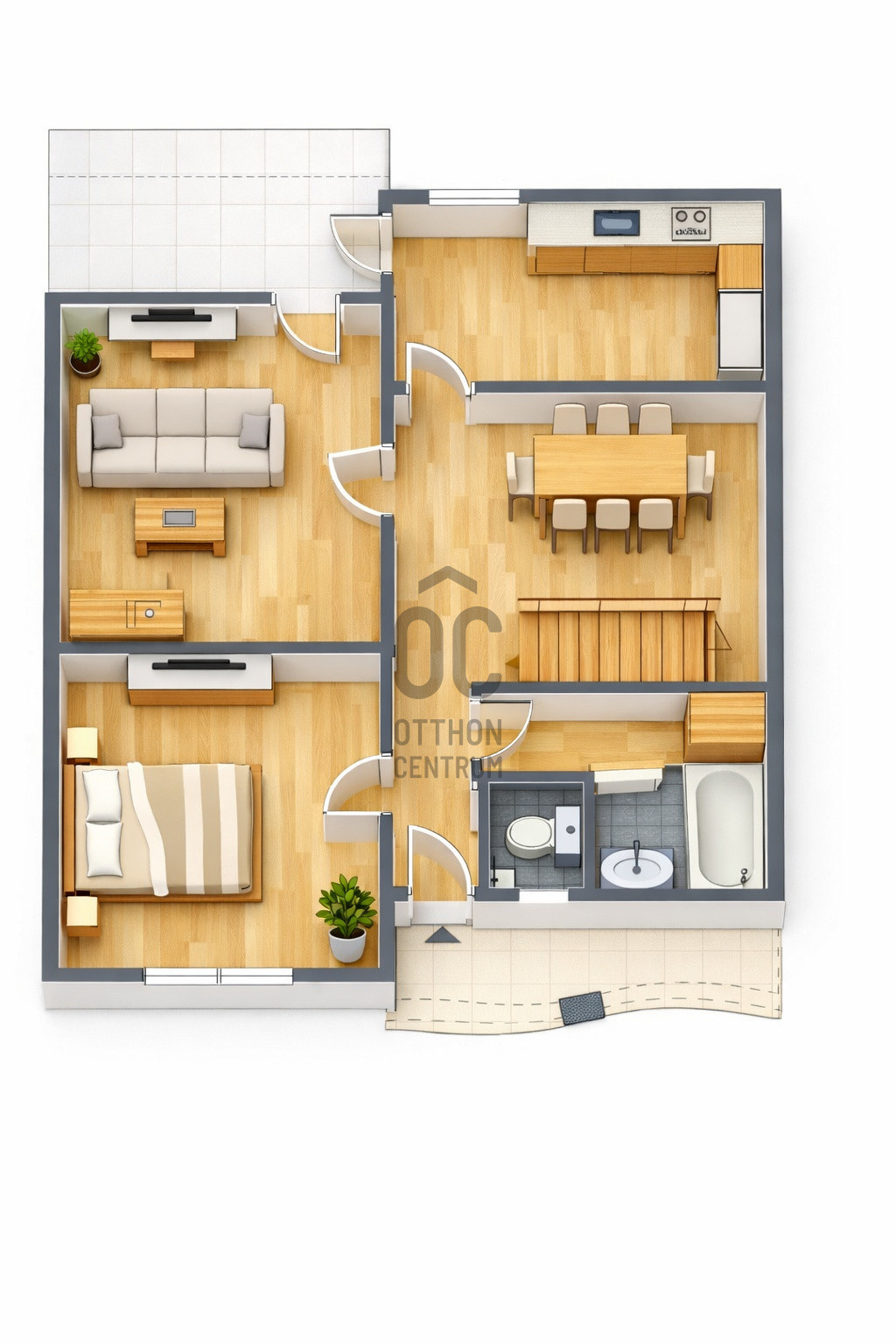 • földszinten: nappali, konyha, étkező, hálószoba, fürdő, külön WC, nagy terasz