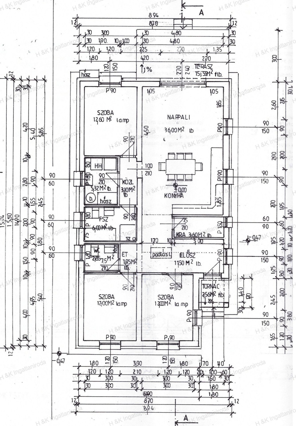 fedett belépő 2,56 nm, előszoba + előtér 13,45 nm, kamra 3,6 nm, nappali – konyha - étkező 36 nm, kapcsolódó terasz 15,55 nm, 3 szoba 12,6 – 12 – 12 nm, külön WC 2,85 nm, fürdőszoba 6 nm, háztartási helyiség 5,32 nm.