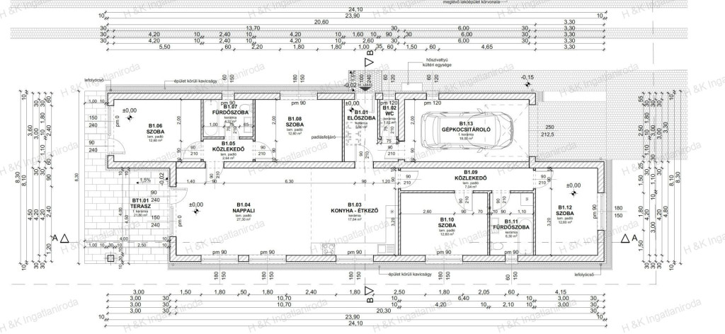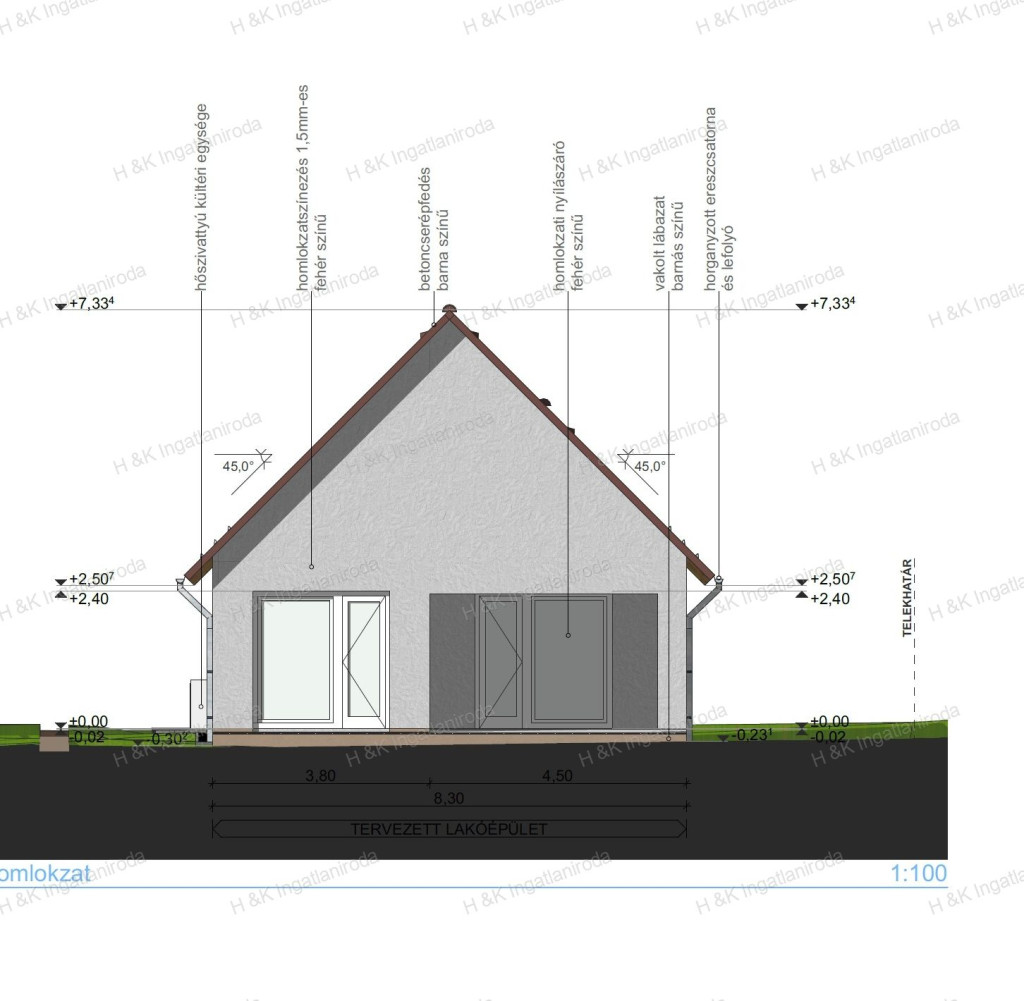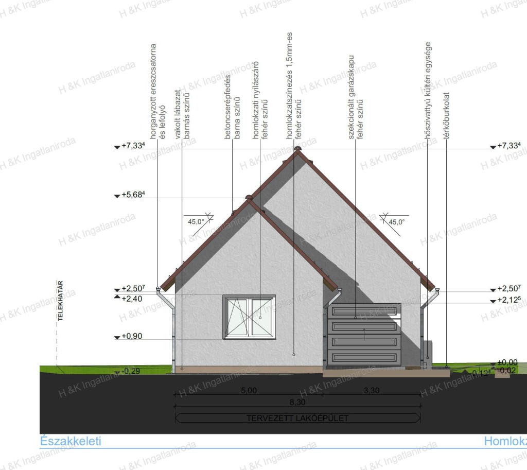 A ház 700 nm-es telekre épül, belső tere a garázzsal 141 nm + 22 nm terasz, amerikai-konyhás nappali + 4 szobás, dupla-komfortos.
