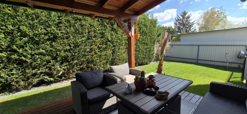 A kert igazi privát oázis: gondozott gyep, magas tujasor biztosítja az intimitást, míg a különleges növényzet – Washingtonia pálmák és olajfa – mediterrán hangulatot teremt. A locsolórendszer a kert örök szépségét és egyben a kényelmet szolgálja.
