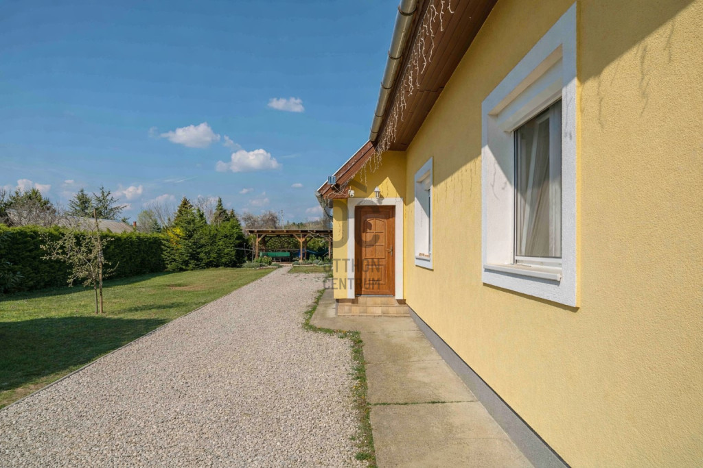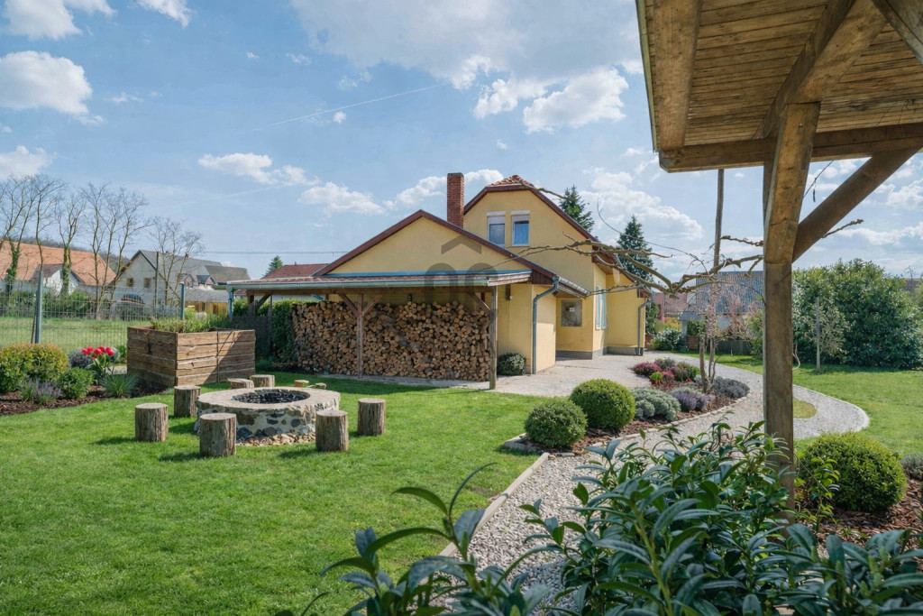 A ház egyik nagy előnye a gyönyörűen rendezett kert, amely ideális pihenésre, családi vagy baráti összejövetelekre. A pergola kellemes helyszínt biztosít a szabadtéri kikapcsolódáshoz, emellett a telek adottságai lehetőséget nyújtanak medence kialakítására is. (a medencés fotó látványterv)