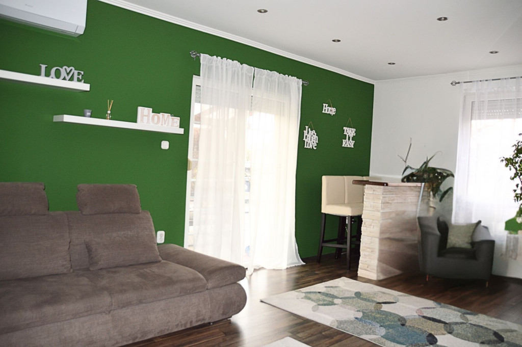 A ház központja a tágas, amerikai konyhás, klimatizált nappali, amely világos és barátságos életteret biztosít.