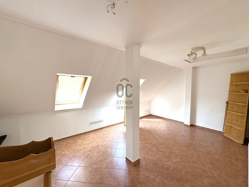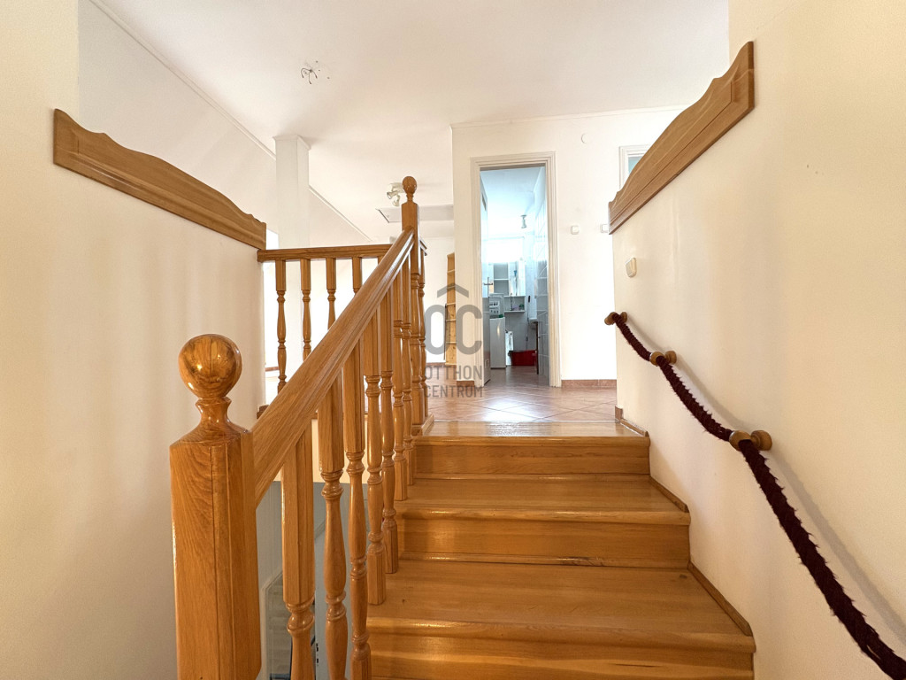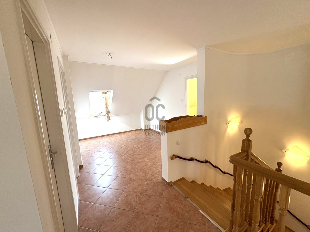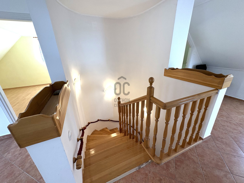 Az emeletre egy igényesen kialakított fa lépcső vezet. A ház vasbeton födémmel rendelkezik, így a padlástér is jól használható.