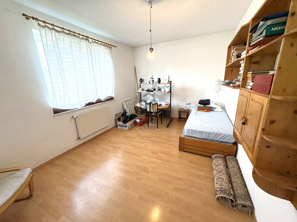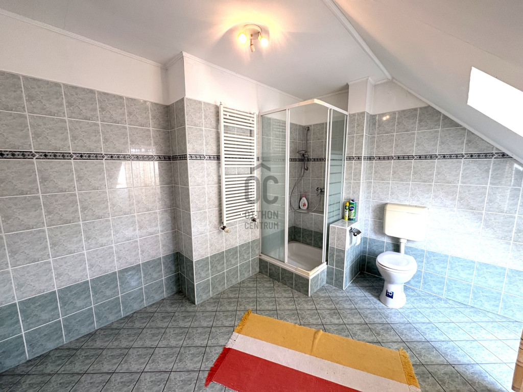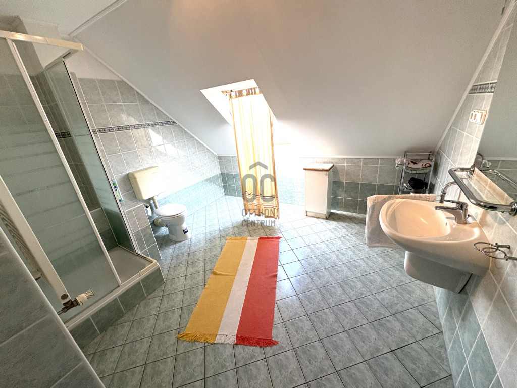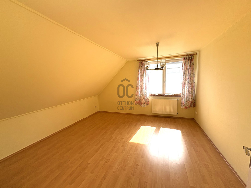 Az emeletre egy igényesen kialakított fa lépcső vezet. A ház vasbeton födémmel rendelkezik, így a padlástér is jól használható.