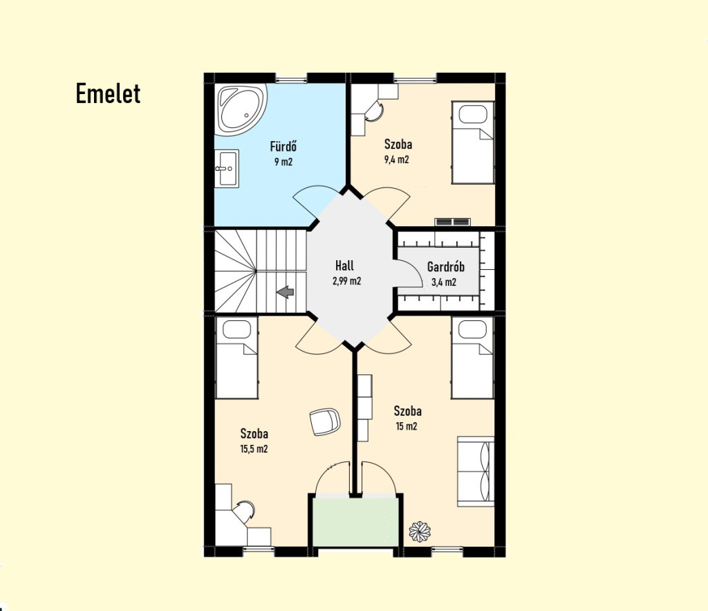 Az emeleti szobák nem tetőtériek, nincs ferde falszakasz – mindenhol teljes belmagasság