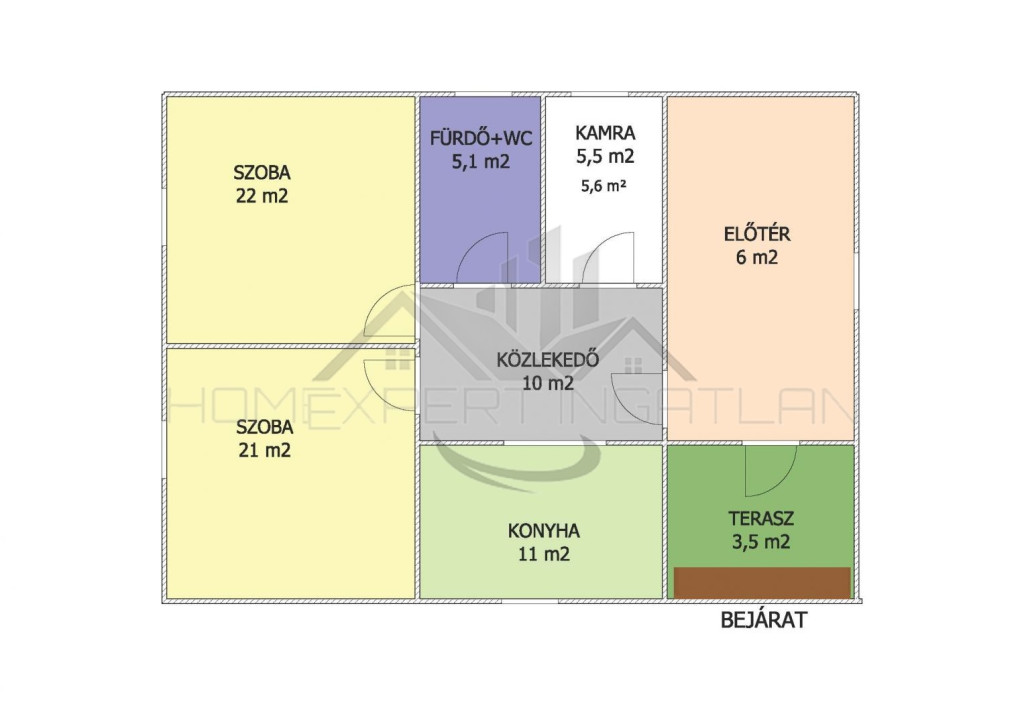 Szélfogó (3,5 m2), előtér (6 m2), közlekedő (10 m2), 2 szoba (21 m2, 22 m2), konyha (11 m2), fürdő +WC (5,1 m2), kamra (5,4 m2). Lásd alaprajz.