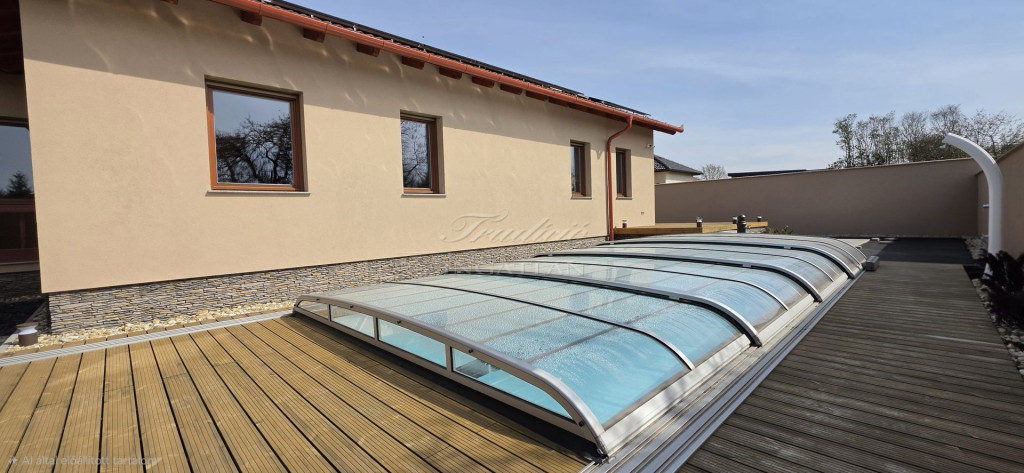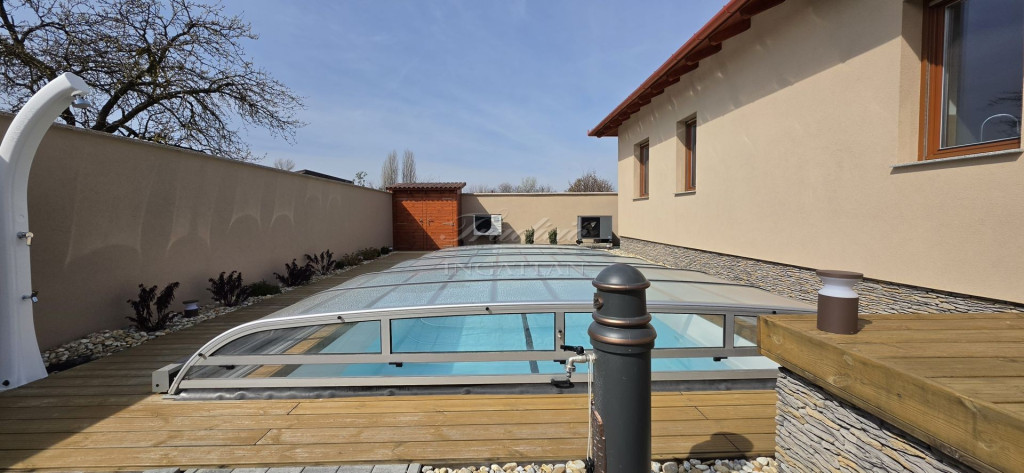 - 8x4 m-es épített sós vízű, automata működésű medence, 12 KW-os hőszivattyús fűtéssel, motoros fedéssel, fa szerkezetű gépészeti házzal, automata PH ellenőrző adagolóval és medencetöltéssel