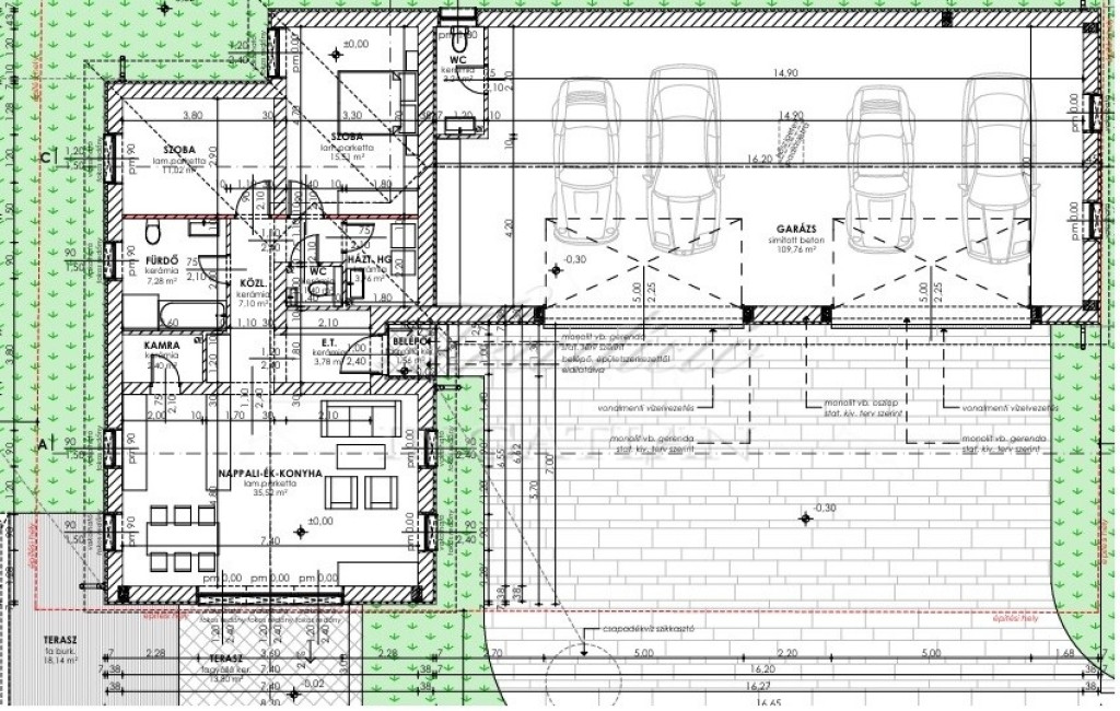 továbbá fedett belépő 1, 56 m2 / terasz automata napellenzővel 32 m2 / GARÁZS 110 M2.