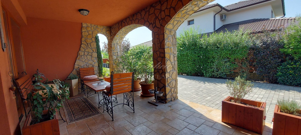 A villa mediterrán hangulatát a hatalmas teraszok, a tetőterasz, valamint a gondozott kert erősítik. Az udvart rengeteg terméskő burkolat és díszítés teszi különlegessé, a telket teljes egészében épített kerítés határolja, a ház pedig ezen belül körbejárható.