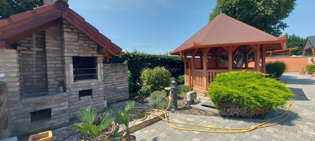 A kertben pagoda, grillező, automata öntözőrendszer (fúrt kúttal), és 40 db. távirányítóval kapcsolható éjszakai világítás teremt különleges atmoszférát.