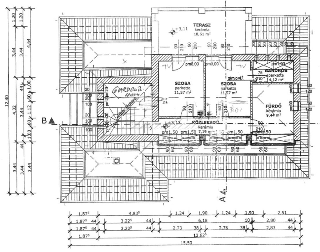 Az emelet kovácsoltvas korláttal ellátott, hangulatos lépcsőházon keresztül közelíthető meg, ahol a közlekedőből nyíló két szoba, gardrób, fürdőszoba, tárolók és egy közel 19 m2-es tetőterasz található.