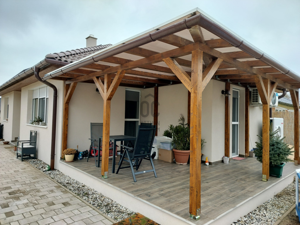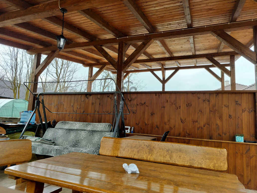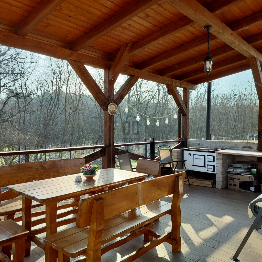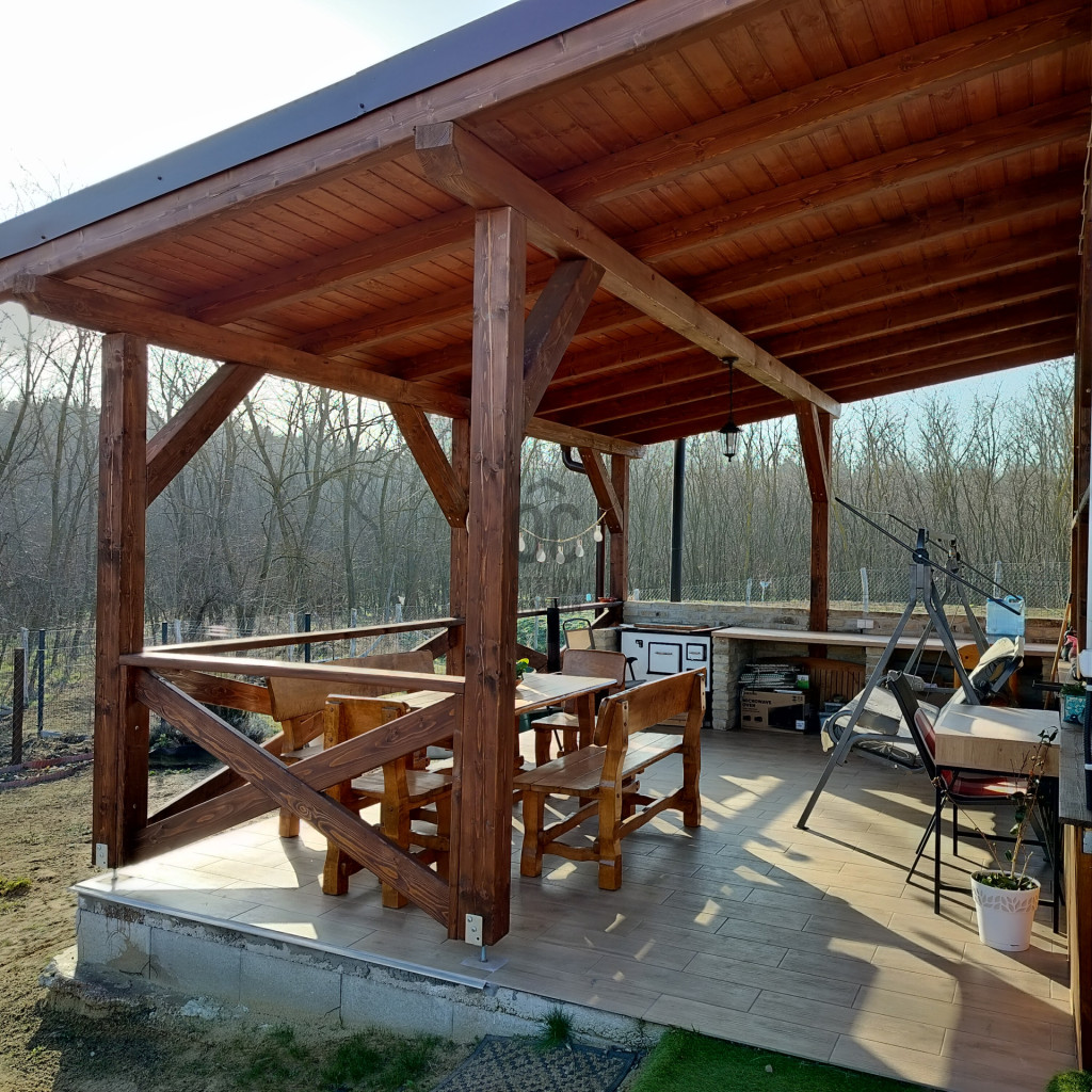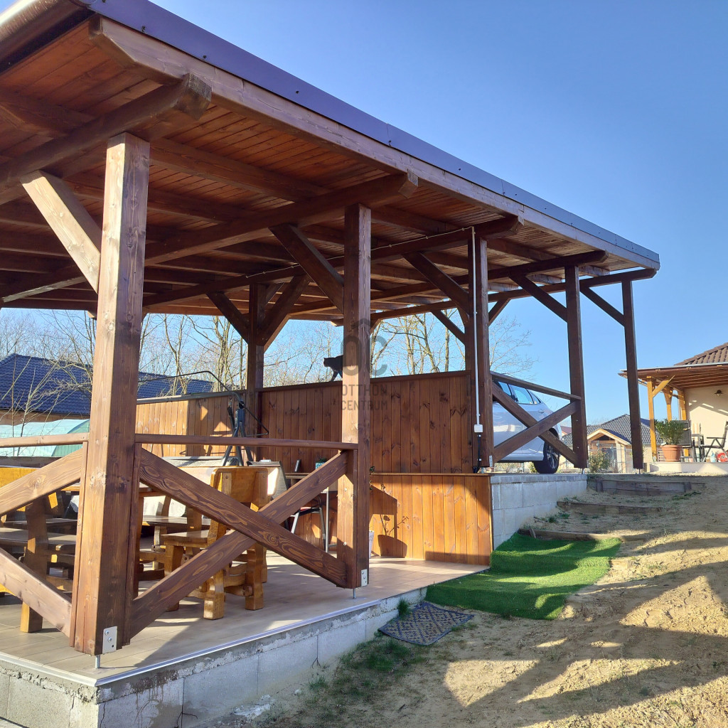 20 m²-es gyönyörű faszerkezetű nyári konyha (áram kivezetve).