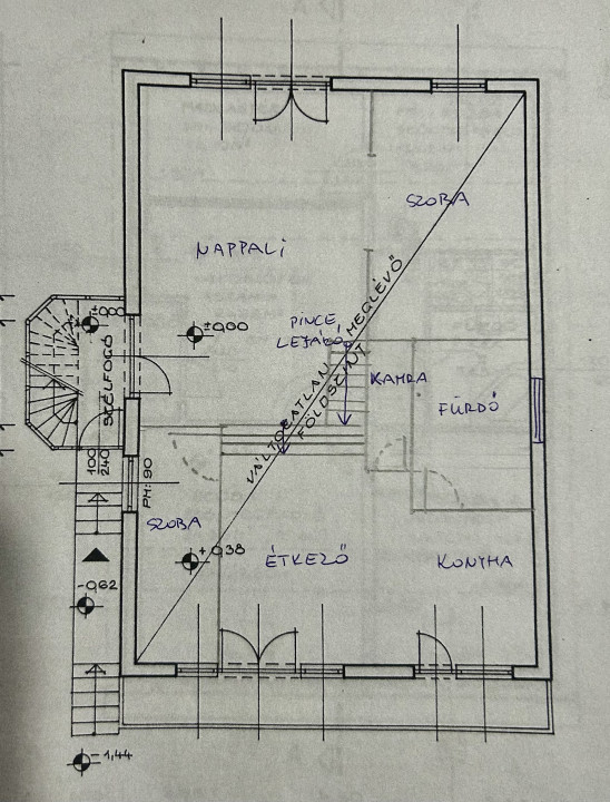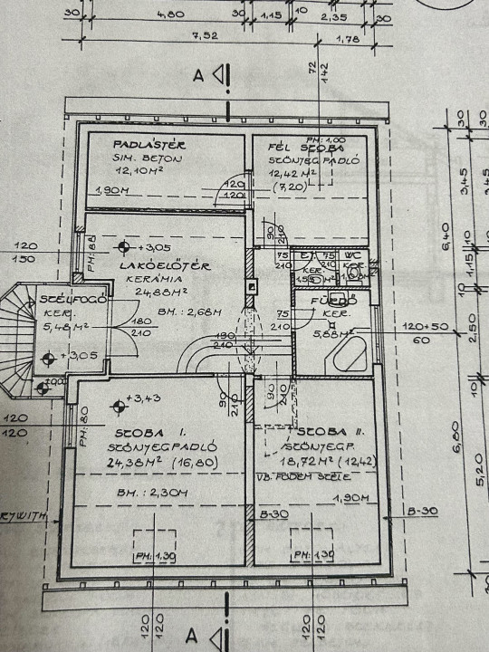 Emelet, kb.: nettó 60 nm / bruttó 110 nm. Nappali, 3 külön nyíló szoba, fürdőszoba zuhanykabinnal, wc-vel, valamint az egyik szobából nyíló, gardróbnak használható padlástér.