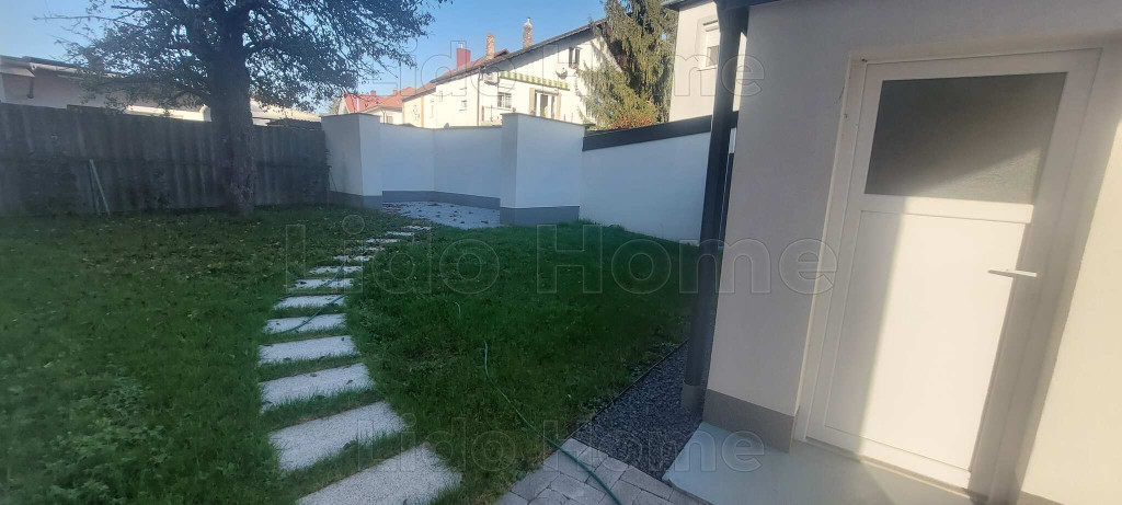 Az ingatlant füvesített, rendezett, körbekerített udvar veszi körbe, térkővel lerakott udvarrész.