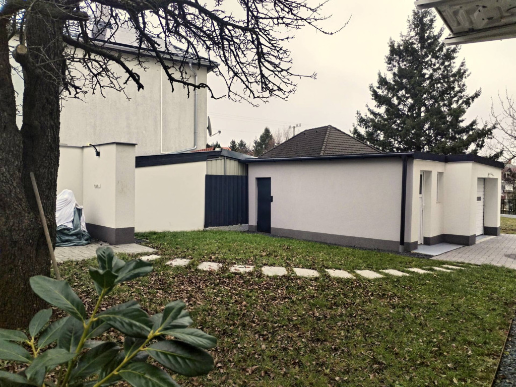 A telken egy 15 négyzetméteres garázs, valamint két különálló, összesen 9 négyzetméteres tároló is helyet kapott, amelyek praktikus megoldást nyújtanak mindennapi és szezonális használatra egyaránt. Valamint helyet kapott egy grill terasz is.
