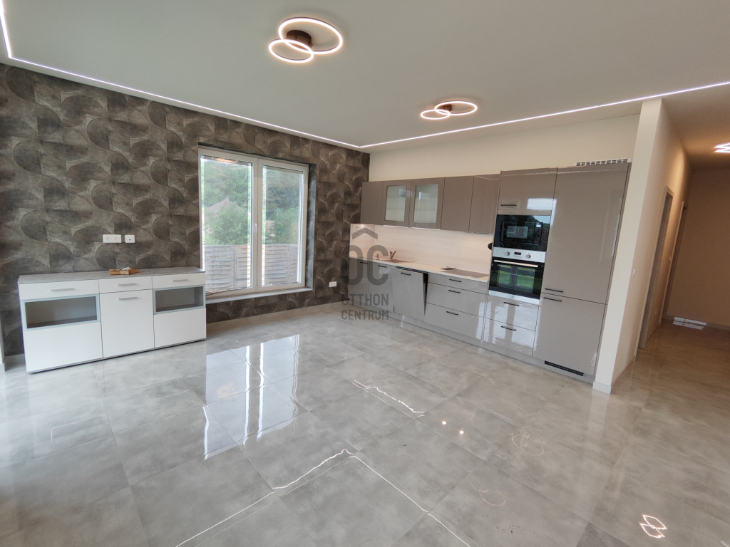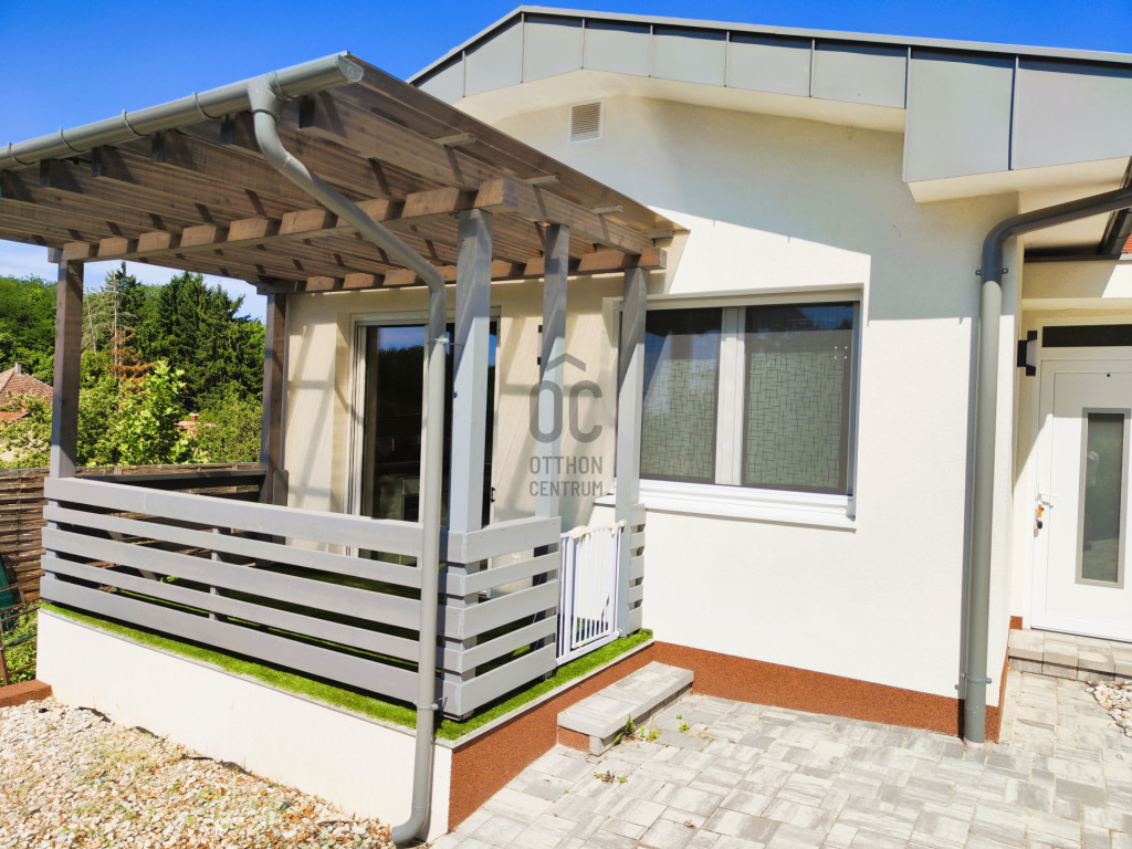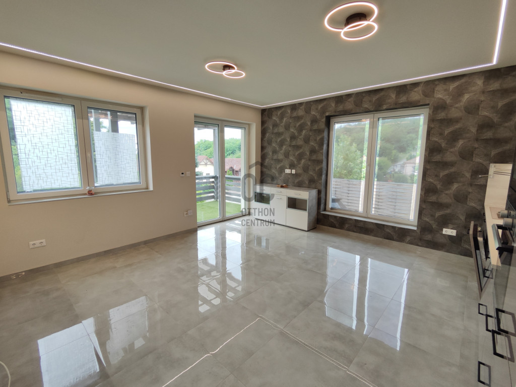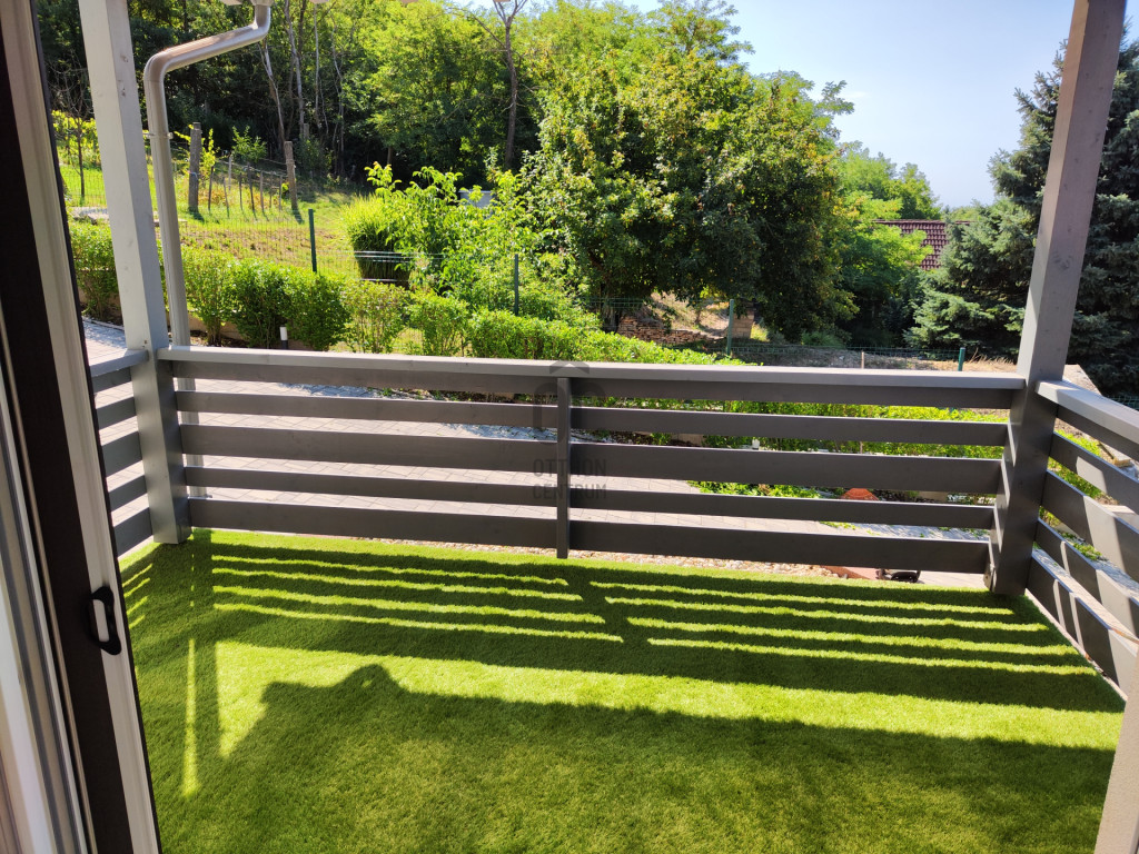 A világos nappaliból közvetlen kertkapcsolatos, épített terasz nyílik, amelyhez gondozott zöldfelület és automata locsolórendszer tartozik.