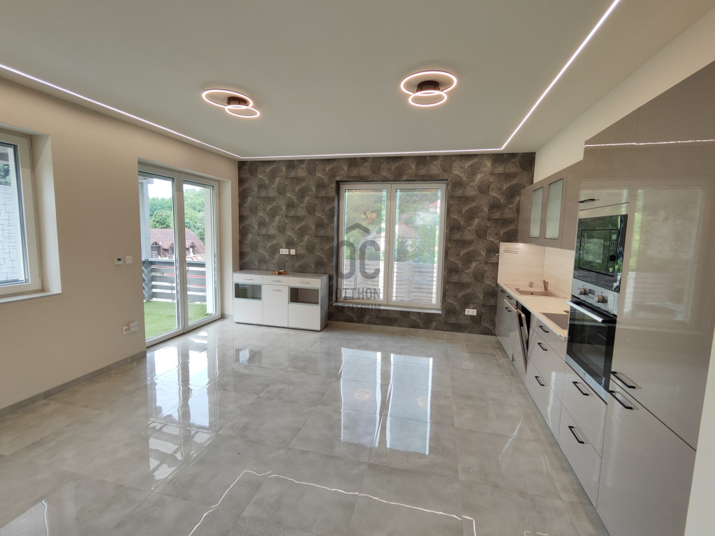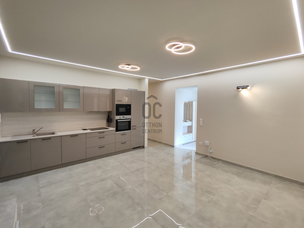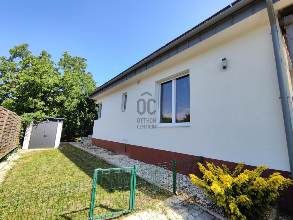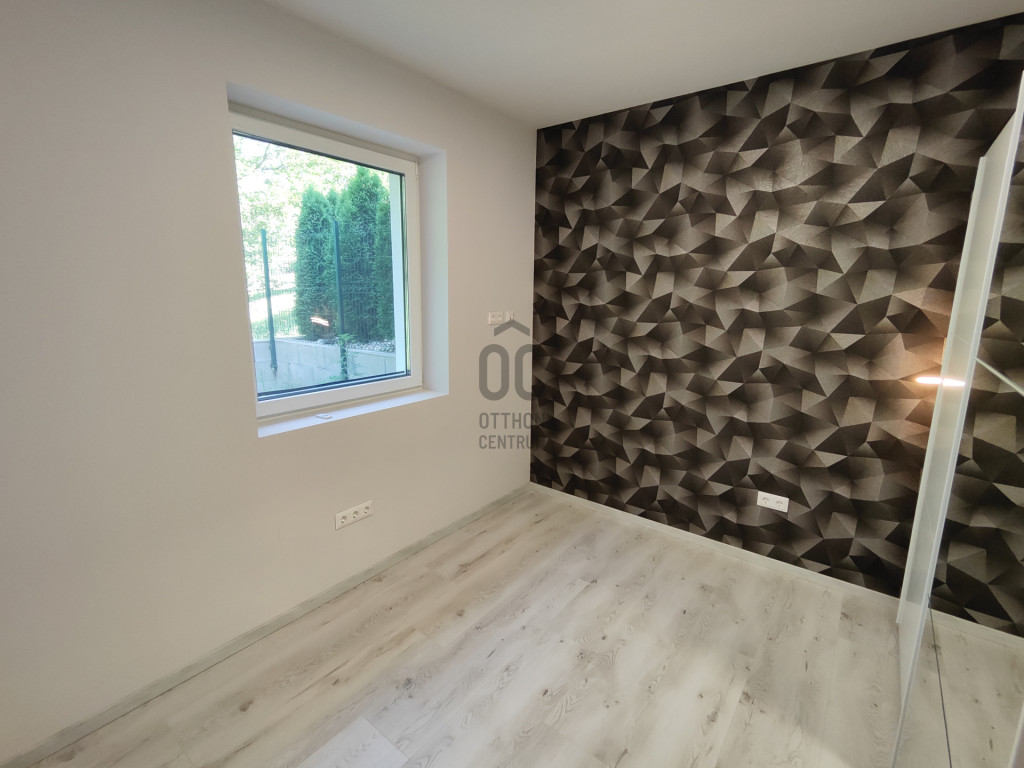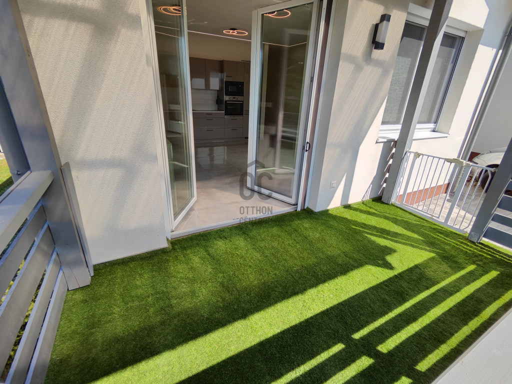 A világos nappaliból közvetlen kertkapcsolatos, épített terasz nyílik, amelyhez gondozott zöldfelület és automata locsolórendszer tartozik.