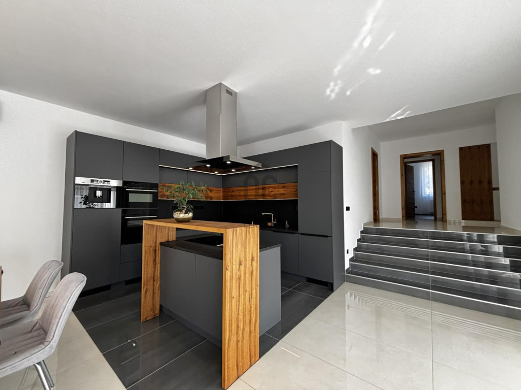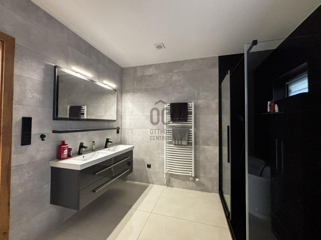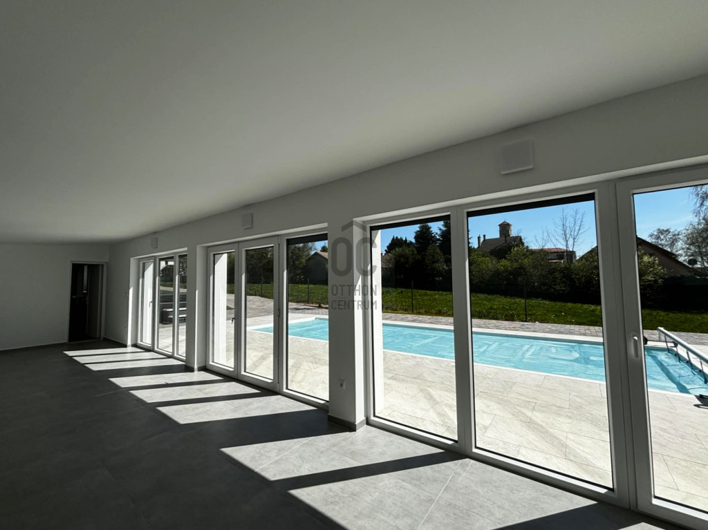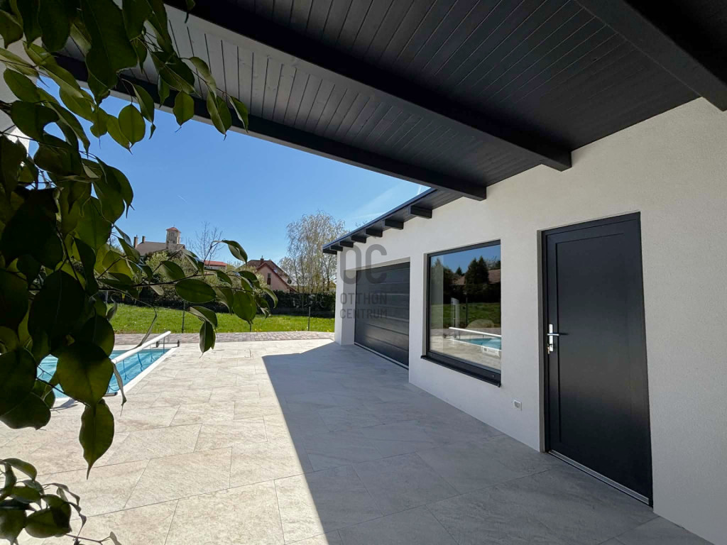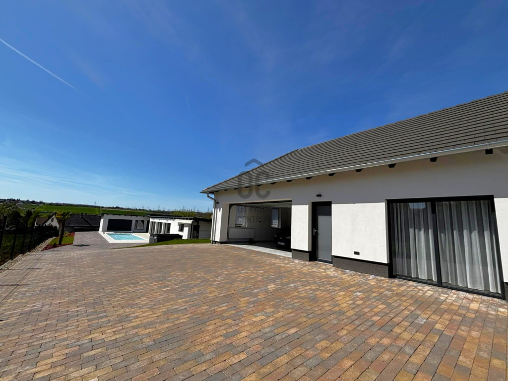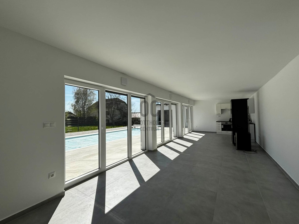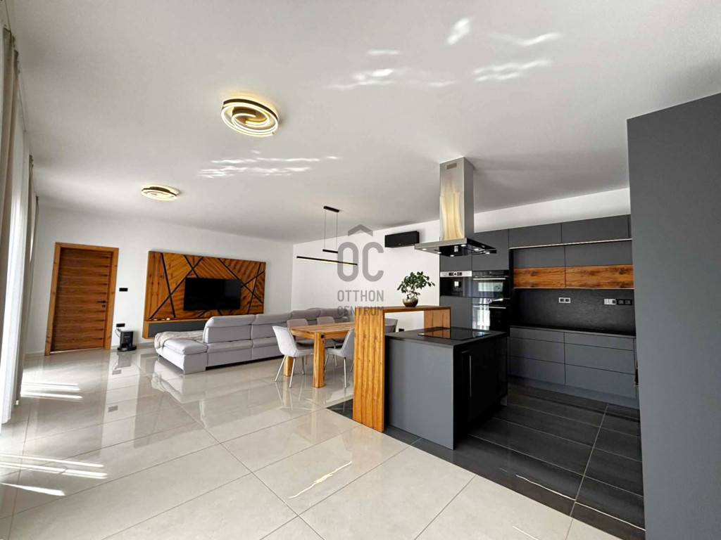 Modern,letisztult stílusú ,a nappaliban panoráma nyílászárók gondoskodnak a napfényes, tágas élettérről .