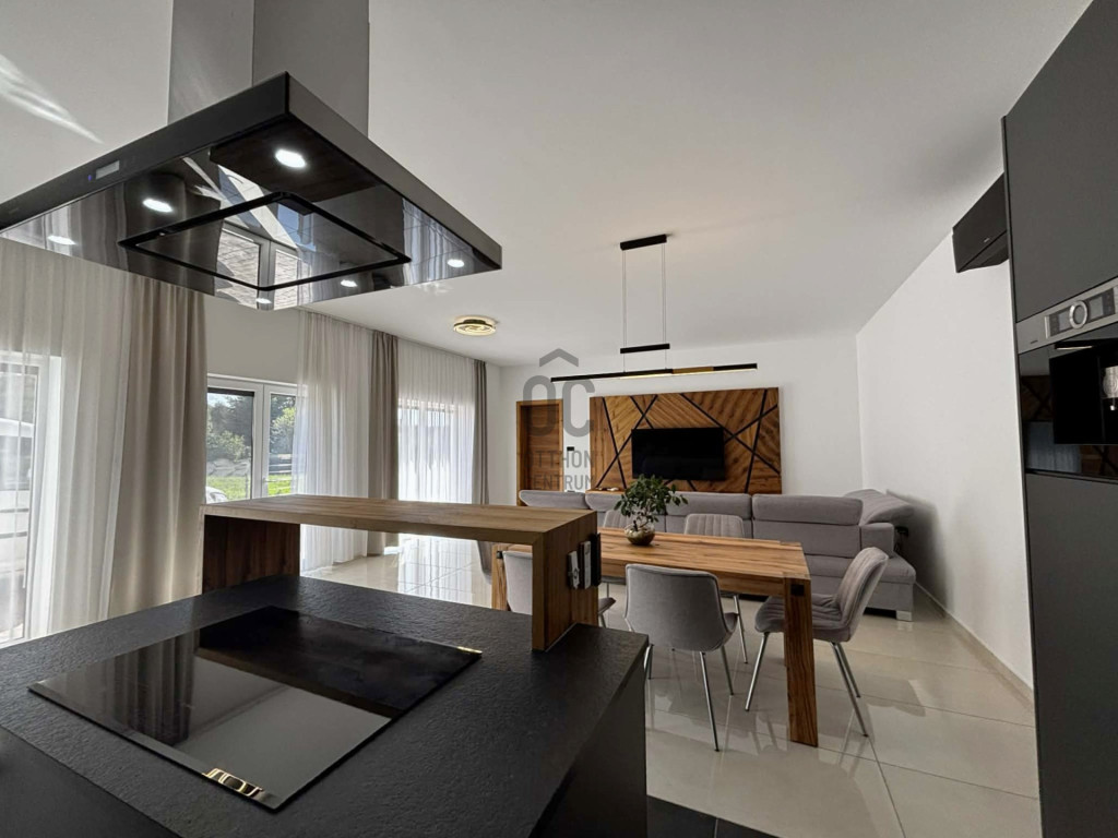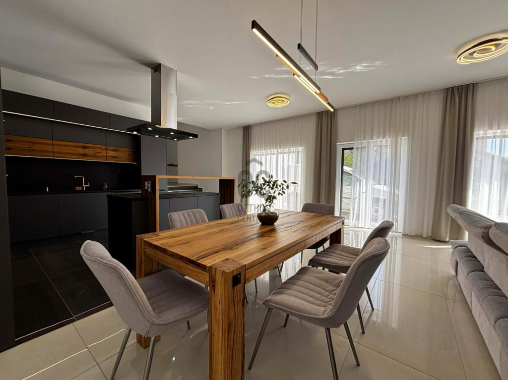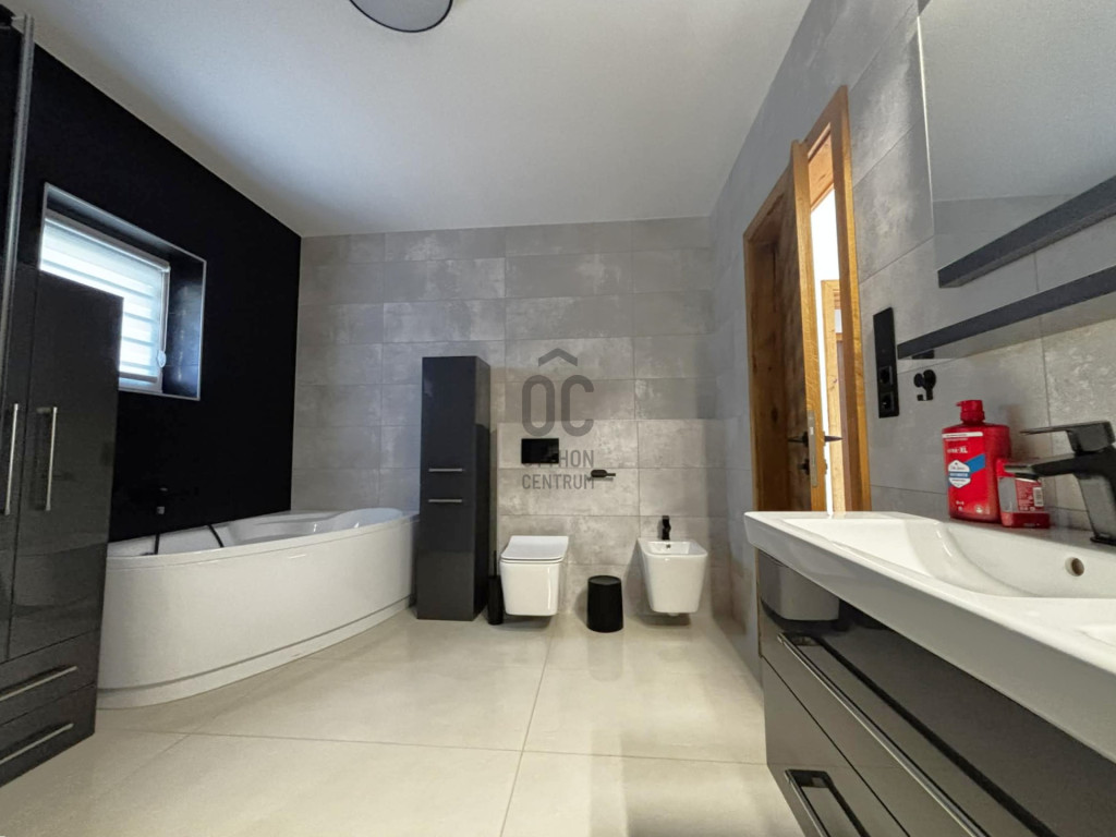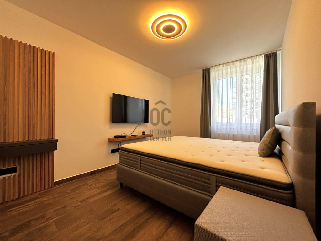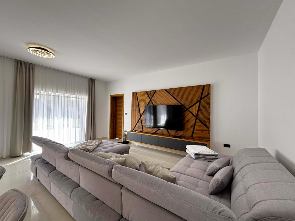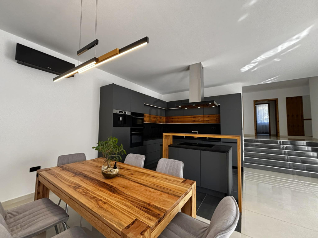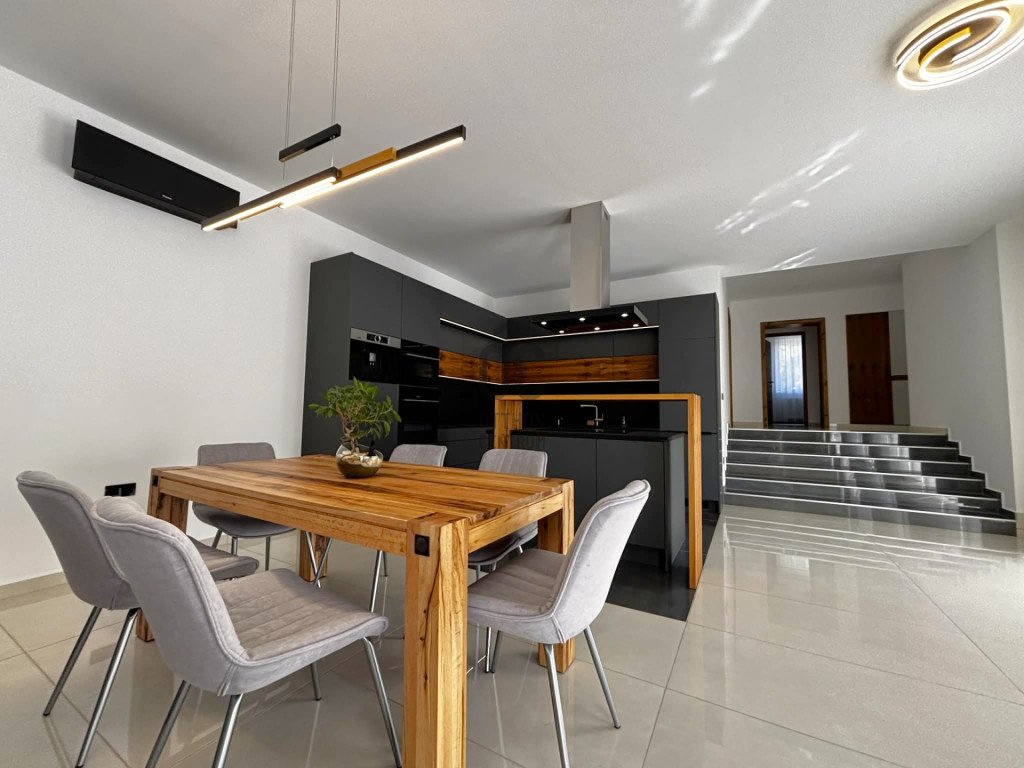 Modern,letisztult stílusú ,a nappaliban panoráma nyílászárók gondoskodnak a napfényes, tágas élettérről .