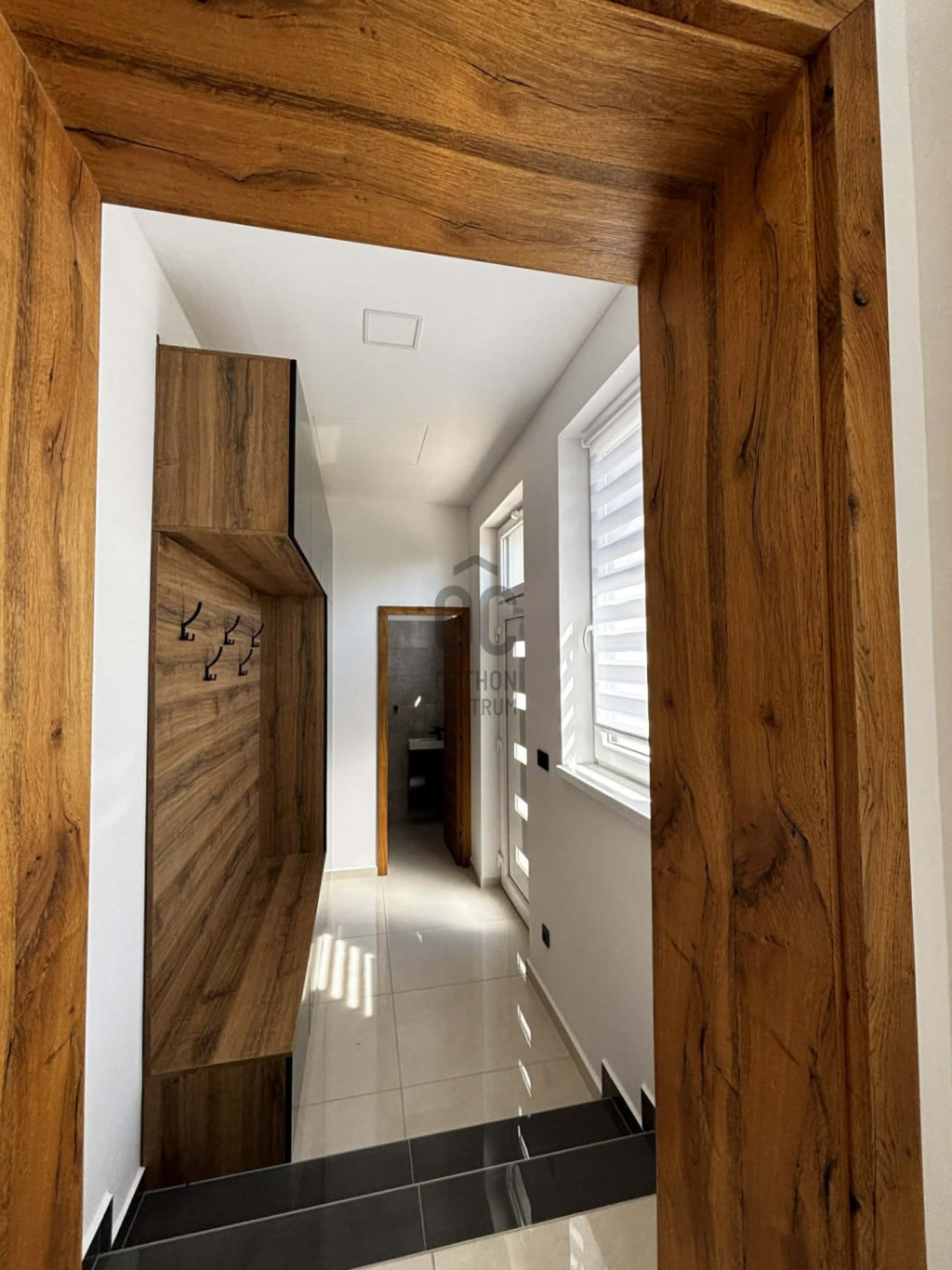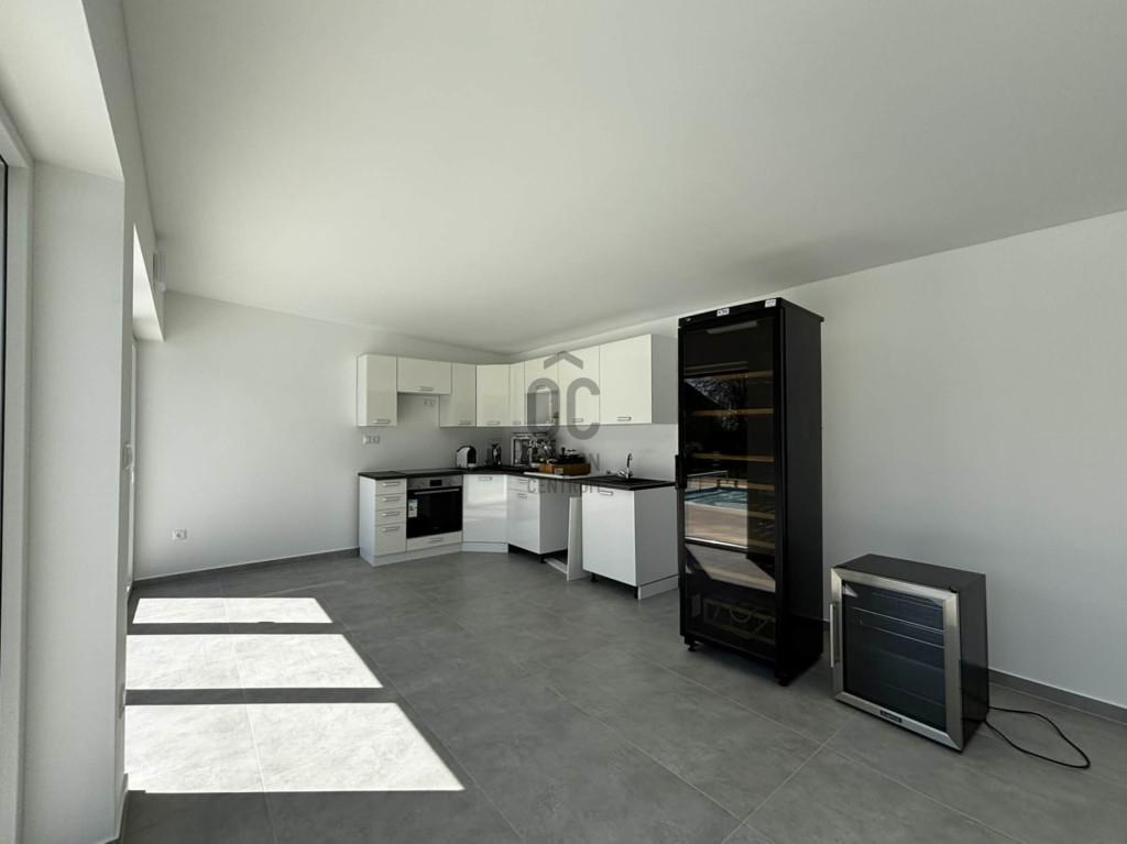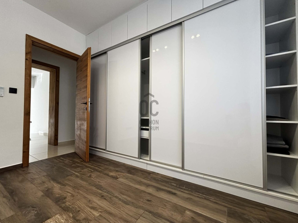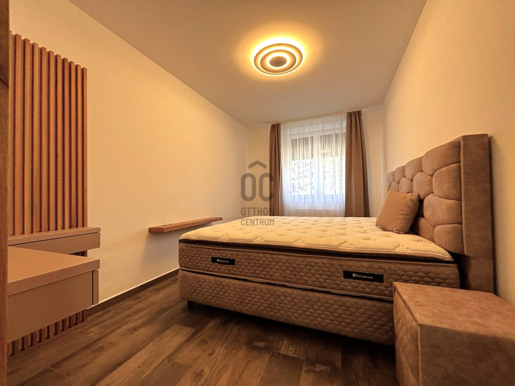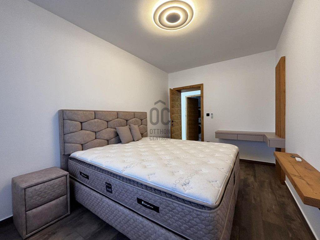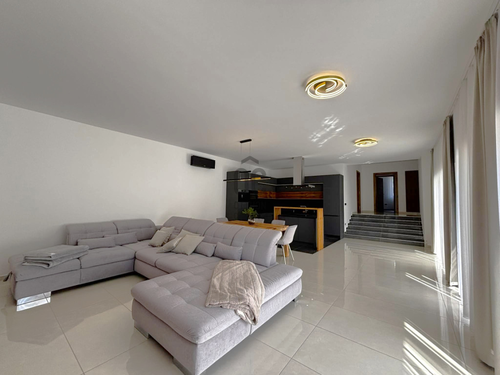 Modern,letisztult stílusú ,a nappaliban panoráma nyílászárók gondoskodnak a napfényes, tágas élettérről .