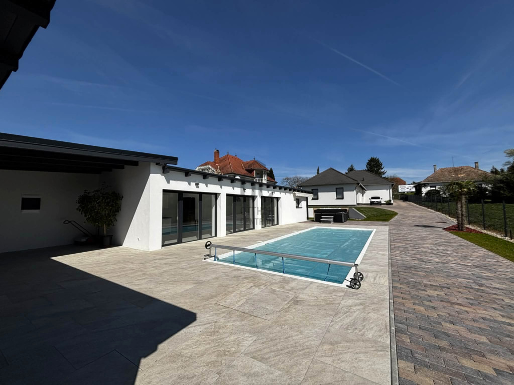 A gondozott, térkövezett telek 1779 nm , kültéri medence, jakuzzi,napozóterasz teszi teljessé már önmagában is egy életérzés: elég nagy ahhoz, hogy egy nagyobb társaság is élvezze, de pont olyan meghitt, hogy akár egyedül, egy könyvvel és egy pohár borral is tökéletes menedék legyen.