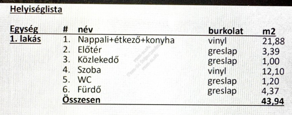 1. lakás 44 m2, 1 hálószoba és nappali. Autóbeállóval. 44 millió Ft.