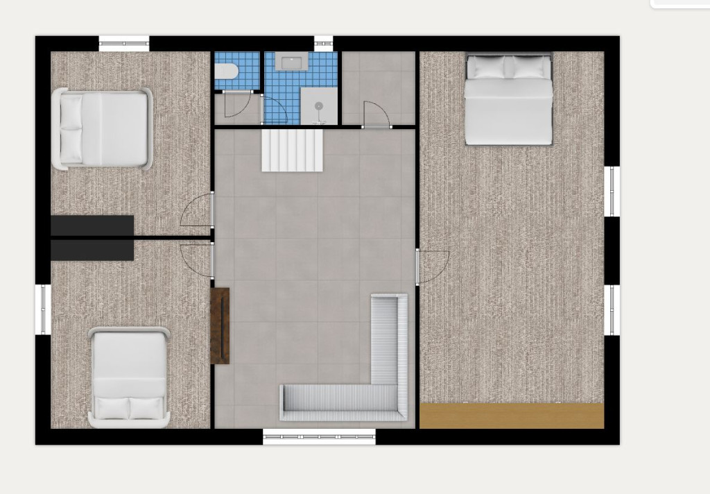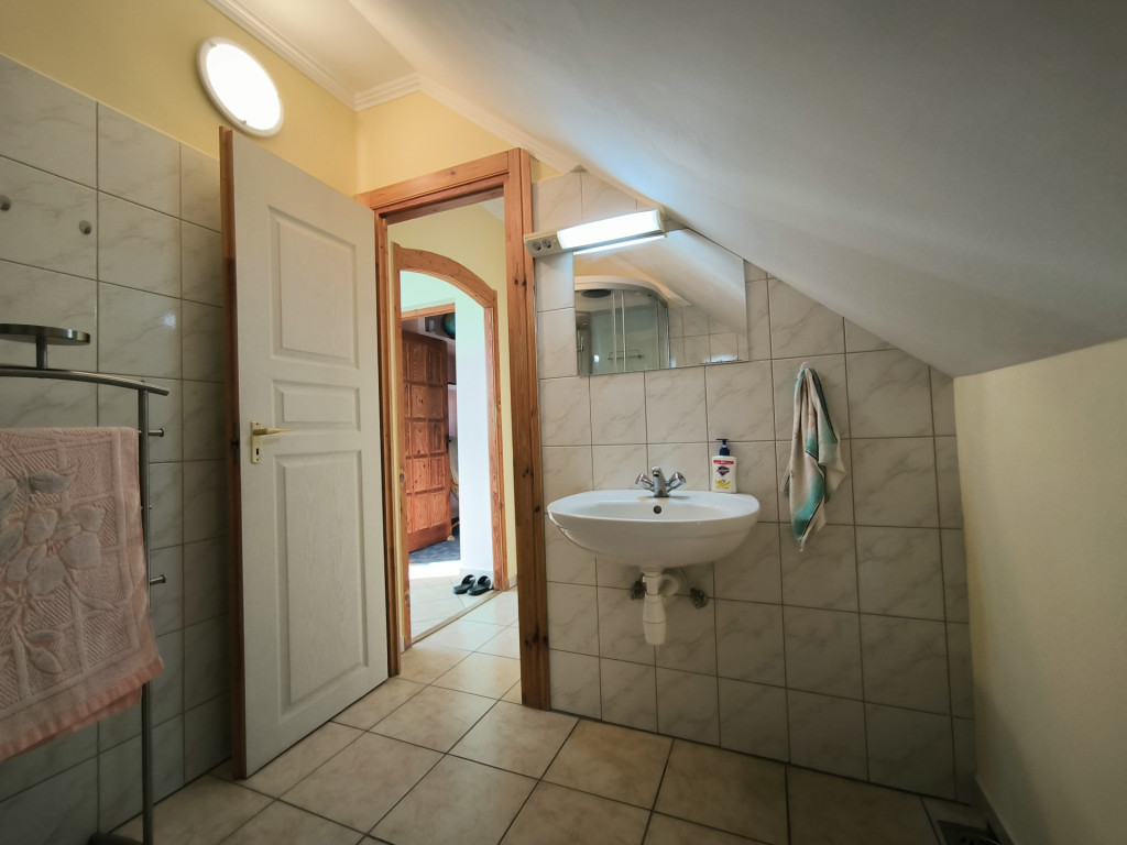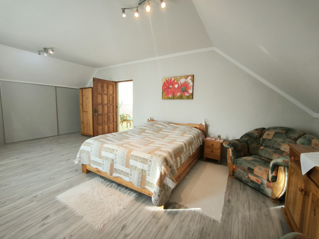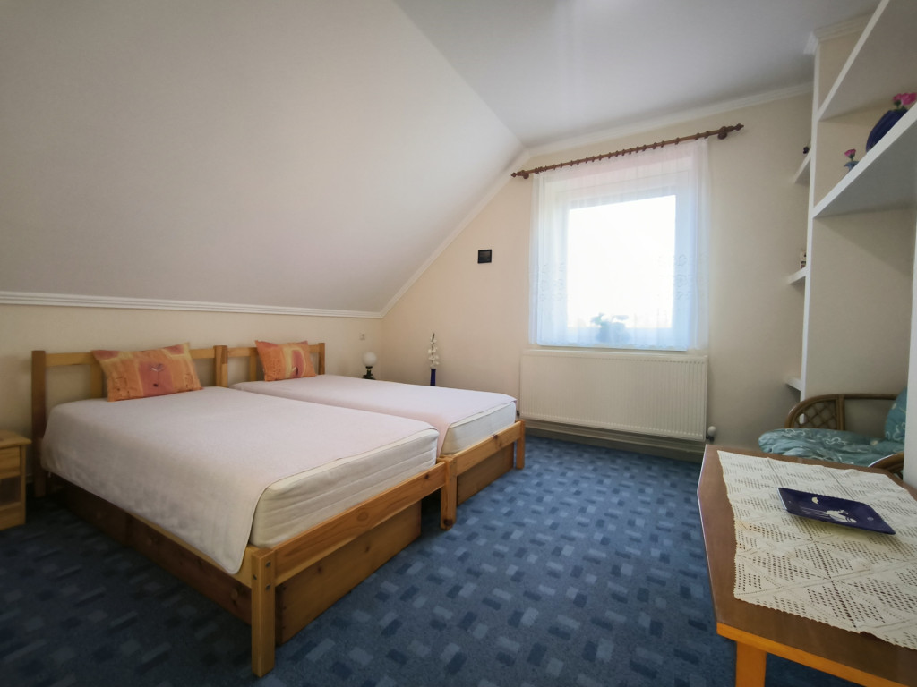 Az emelt térdfalas tetőtér központi részén kialakításra került egy nappali, melyből megközelíthető a három hálószoba, valamint a fürdőszoba.