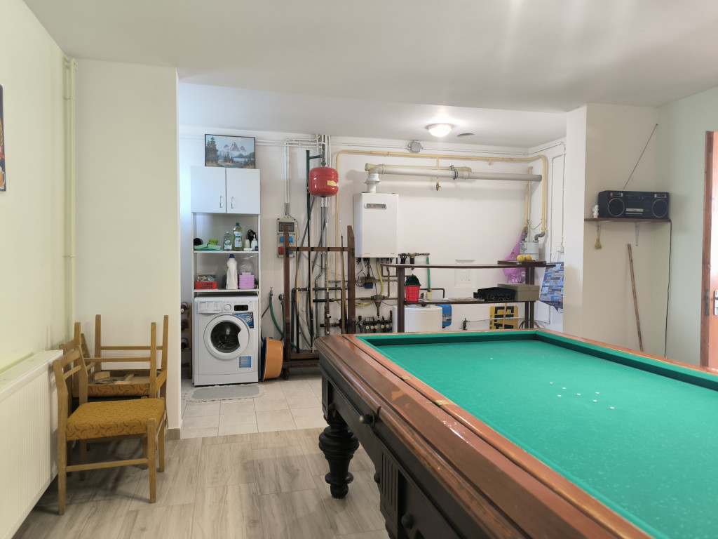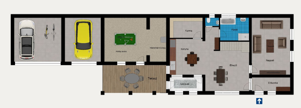 A garázsok (26 + 19 m2) és a főépület között, kialakításra került egy a teraszról megközelíthető 29 m2 alapterületű hobby szoba, amely a terasszal együtt tökéletes helyszíne lehet családi-, vagy baráti összejöveteleknek.