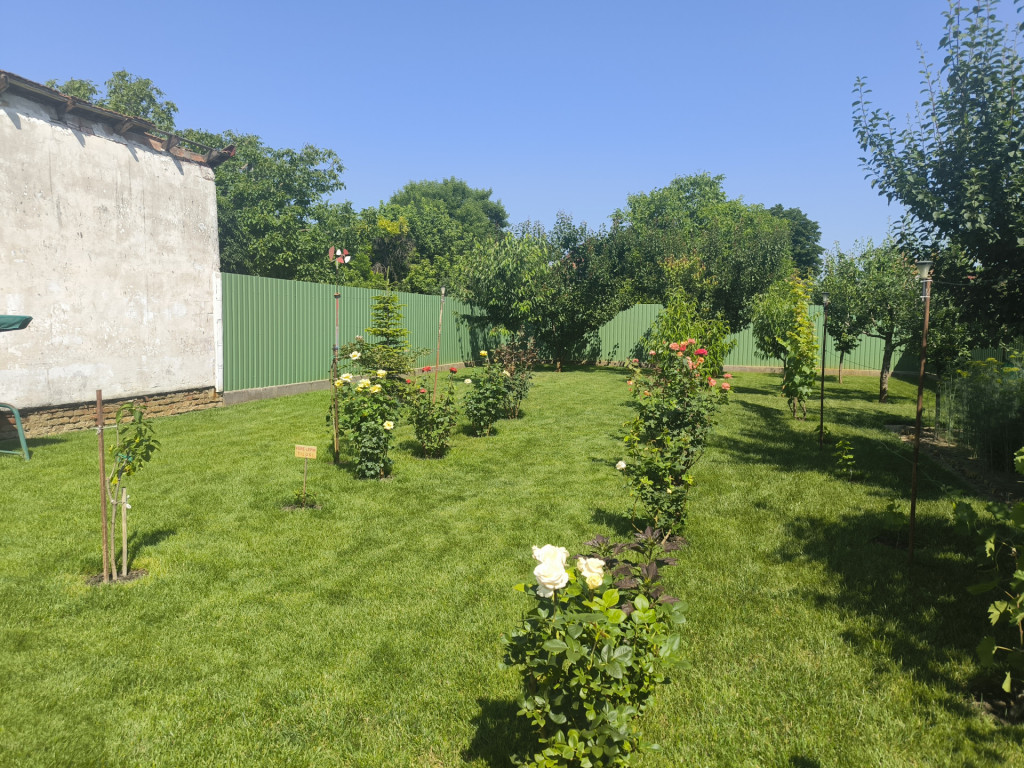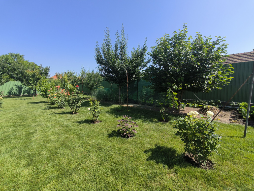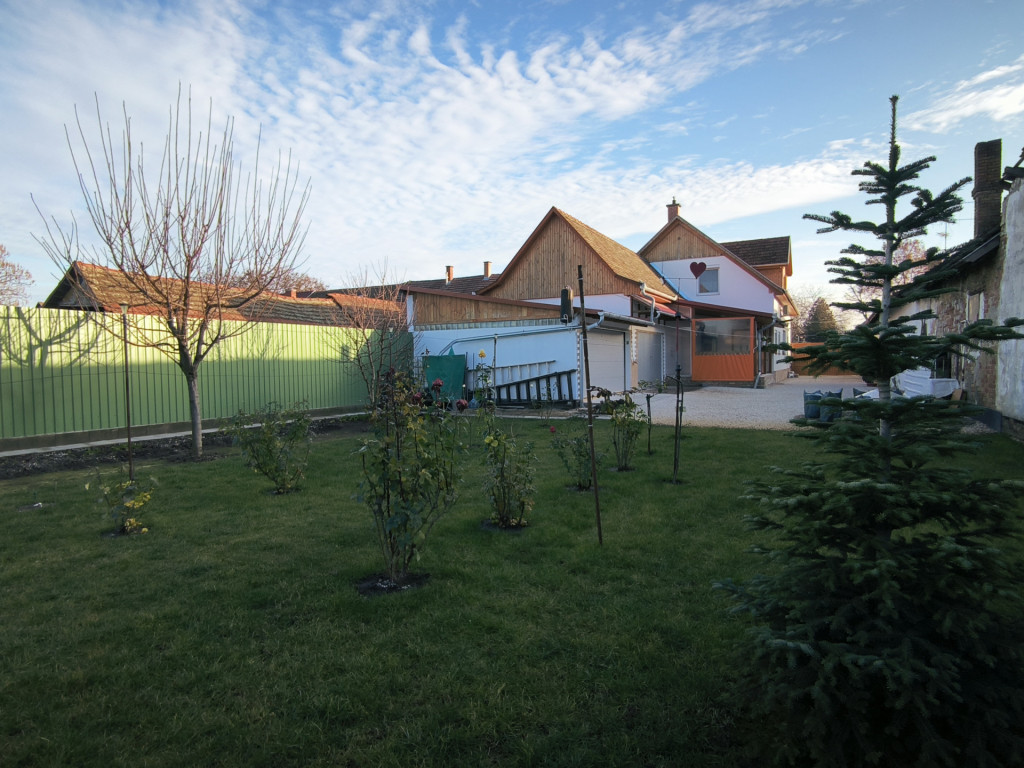Az udvarba elektromos mozgatású nagykapun keresztül juthatunk be, ahol akár három személyautó elhelyezésére alkalmas garázsok találhatóak. A parkosított kertben termő gyümölcsfák és szőlő került telepítésre, melyek öntözéséhez fúrt kút biztosít vizet.