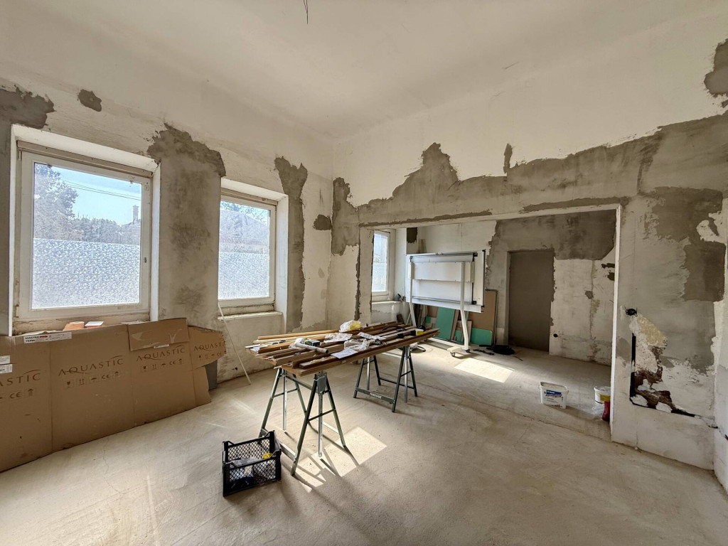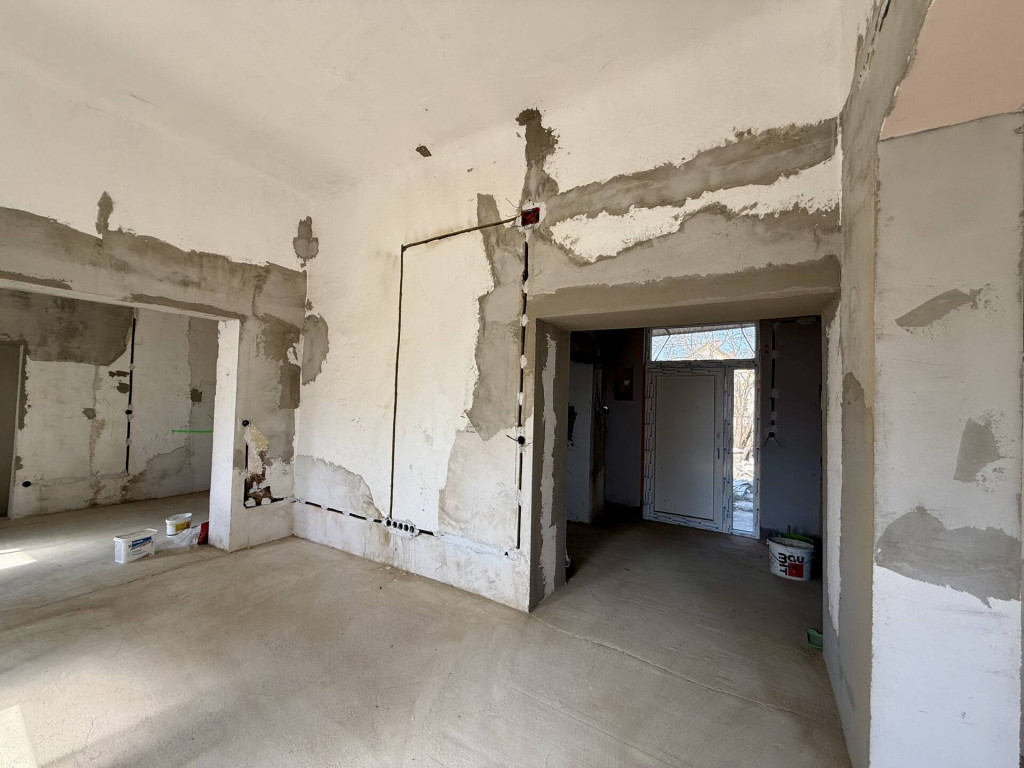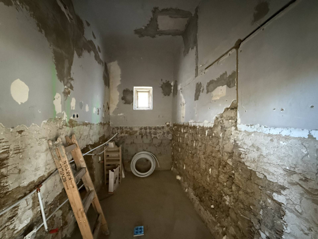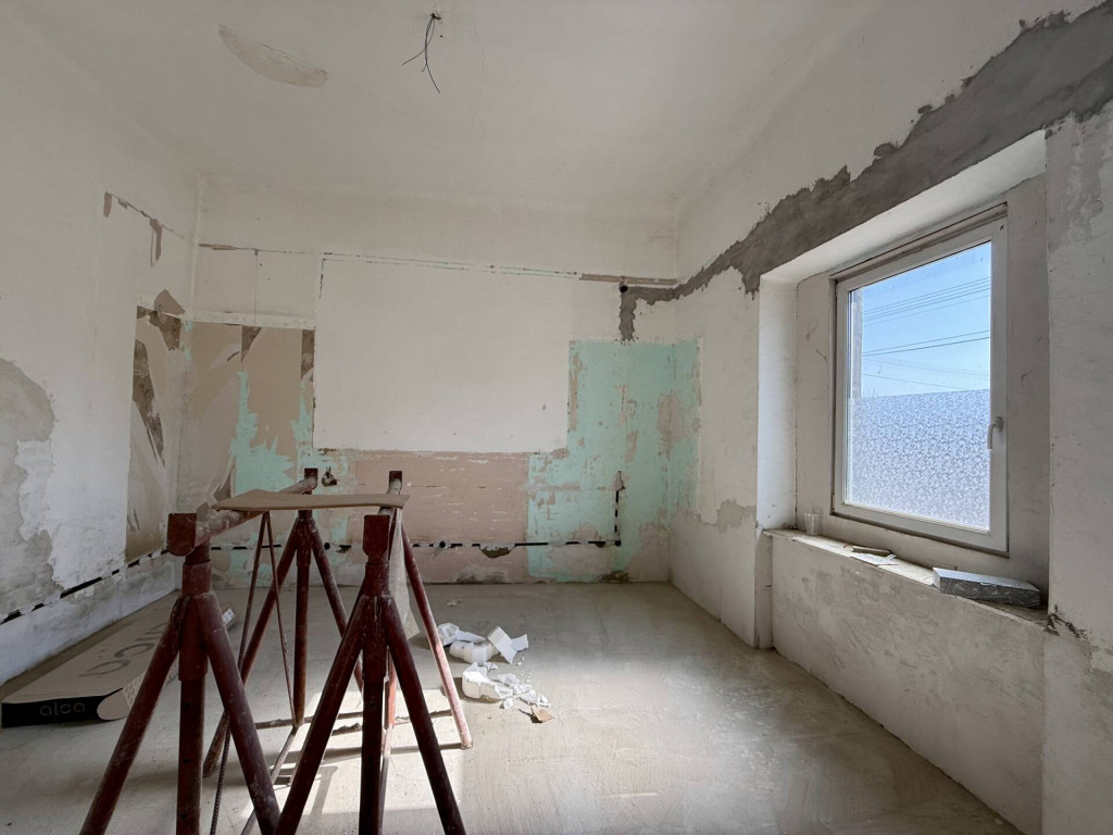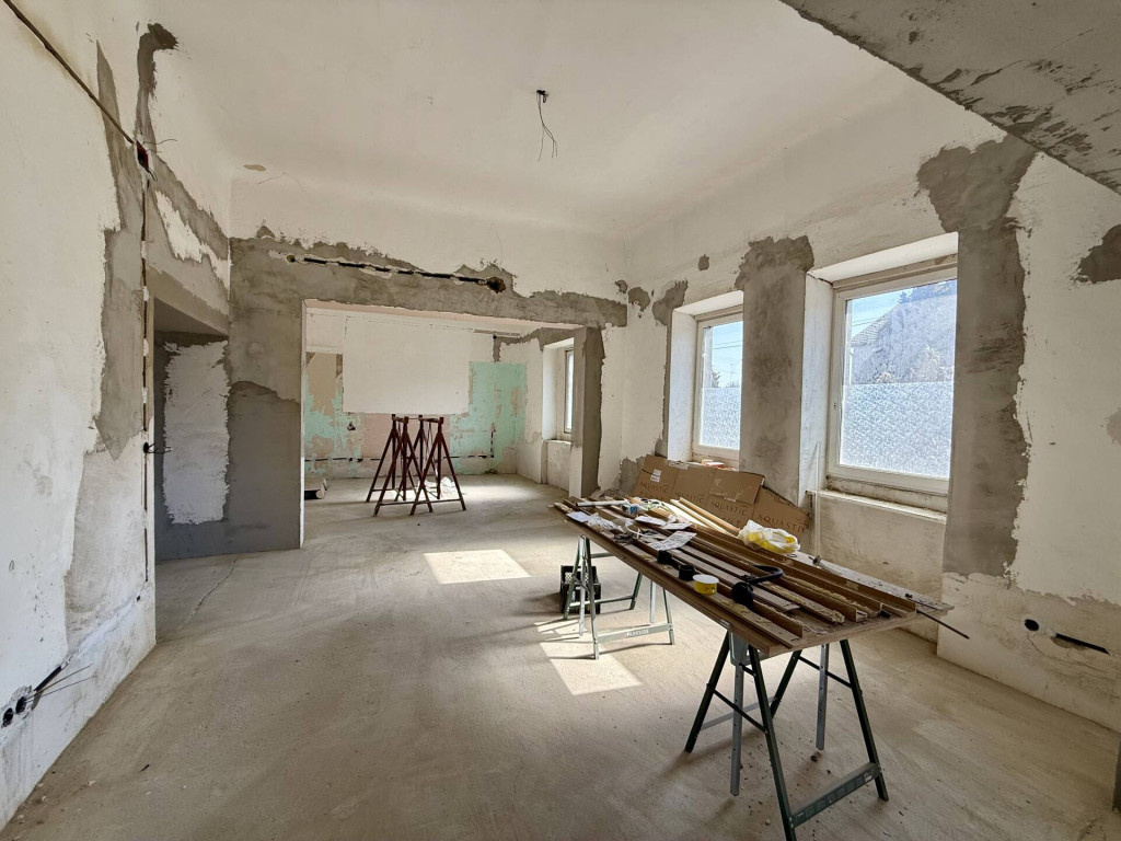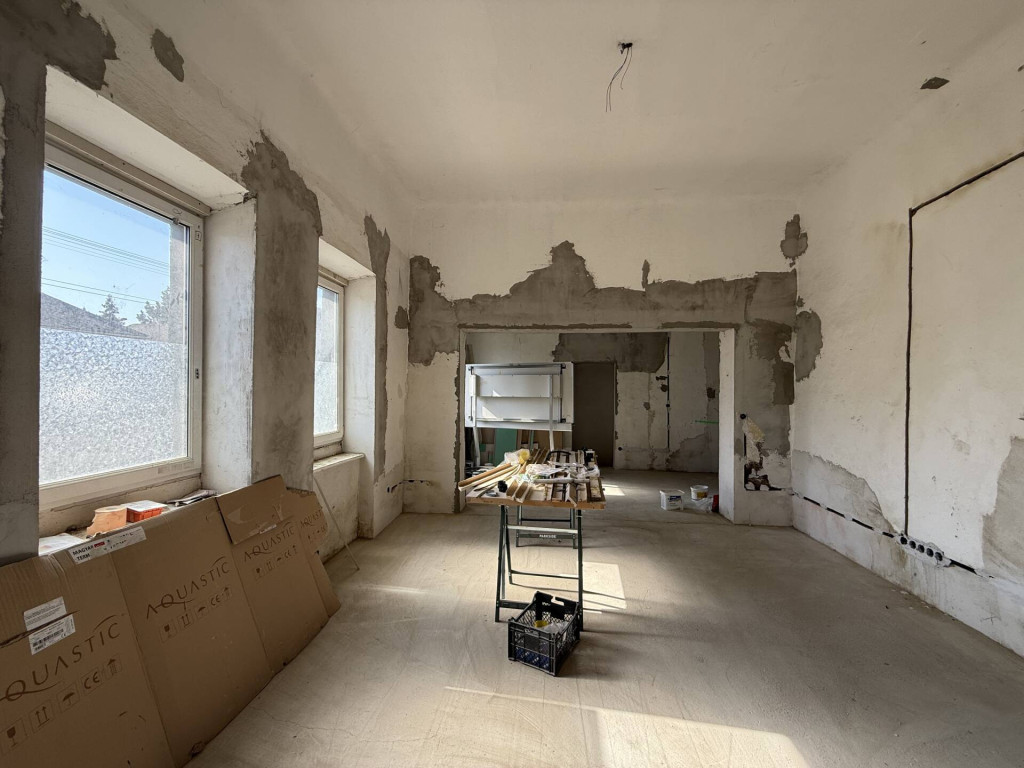 Jászladány FŐUTCÁJÁN elhelyezkedő, felújítás alatt álló, egyterűsített MŰANYAG NYÍLÁSZÁRÓS ház eladó kis zárt udvarral.A FELÚJÍTÁS elkezdődött, Önre vár a befejezés! LÉGIES és TÁGAS térszerkezet került kialakításra 3 utcai szoba szakszerű EGYBENYITÁSÁVAL. Megtörtént a nyílászárók műanyagra cserélése, az új áram vezetékek BECSÖVEZÉSE, részlegesen az újravezetékelése, a régi burkolatok leverése. Az ÚJ víz és szennyvíz CSÖVEK megépítése, valamint az egész épület ALJZATBETONOZÁSA is kész. Ami hátra van és a vevőre vár: villanyszerelés befejezése, új burkolatok és a fűtés, ami a tervek szerint hűtő-fűtő klíma. (Korábban volt gáz fűtés az épületben, de azt megszüntették.) Remek lehetőség annak aki egyébként is felújításban gondolkodott, hiszen a munka piszkos része el van végezve. Kartonfalakkal a régi szobákra tagolt térszerkezet visszaállítható, azonban jelenleg roppant izgalmas és KÜLÖNLEGES a bálteremnyi méretű egybefüggő lakótér! Jelenlegi formájában alkalmas akár KÖZÖSSÉGI ESEMÉNYEK lebonyolítására, KISKERESKEDELMI CÉLRA, vagy átalakítással családok számára. Érdemes kihasználni a felújításhoz az 5+5 milliós állami energetikai korszerűsítési pályázatot illetve az ingyenes födémszigetelést.