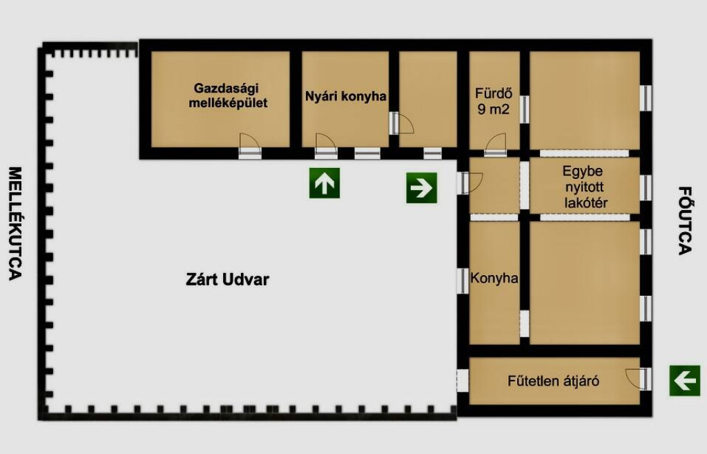 — A FŐUTCAI lakóépület két utcára jár. Az épület utcafronton álló, hátsó kertjébe autóval a párhuzamos, szintén aszfaltos, utcáról lehet beállni. Az épület előtt térkövezett járda és mély csapadékvíz elvezető árok húzódik. A település központja 5 perc gyalogjárásra található.