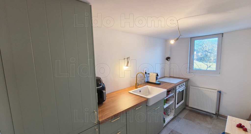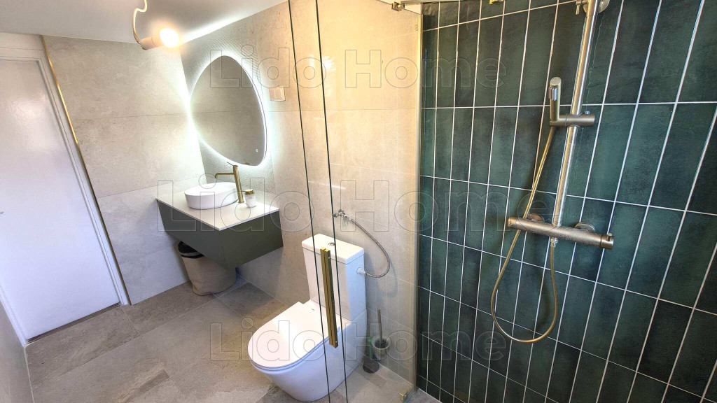 -Modern stílusban megvalósított és felszerelt konyha és zuhanyzós fürdőszoba.