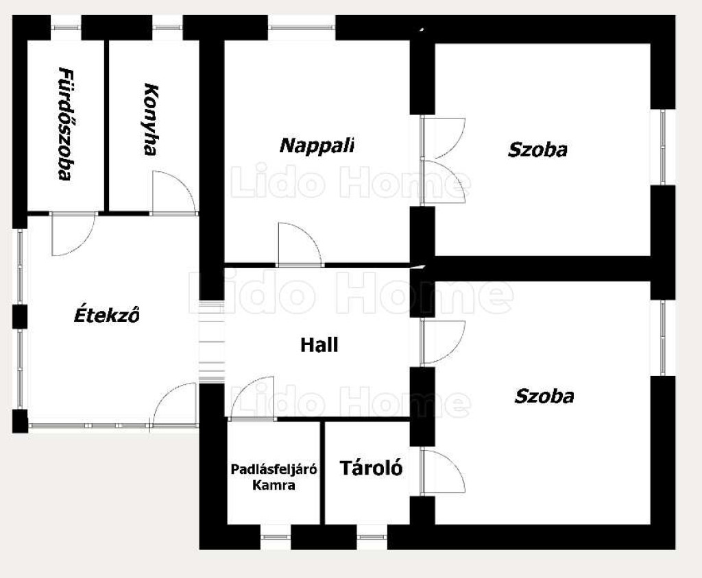 -Az épület helyiségei: Előtér étkezővel, nappali, 3 szoba, Berendezett konyha és zuhanyzós fürdőszoba.. Továbbá két tároló, melyből az egyikből jutunk fel a padlásra. A másikból igéyn szerint akár még egy fürdőszoba kialakítható.