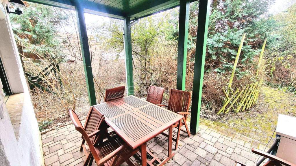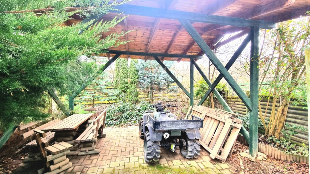 A 800 nm-es gondozott, vadregényes ,intim telken grillező terasz és e fedett kocsibeálló lett kialakítva.