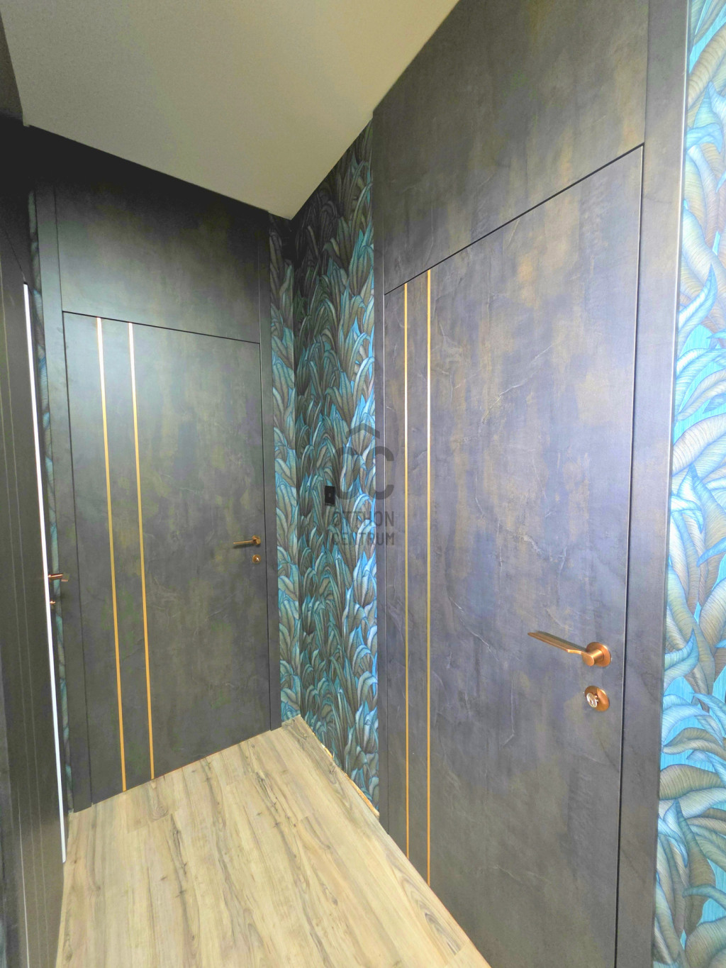 Beltéri ajtók tokba záródó, tokba nyíló mágneses szerkezetűek és a menyezetig érnek. Külföldi gyártóktól kerültek megrendelésre egyedi igények alapján, rosegold betétekkel és kilincsekkel.