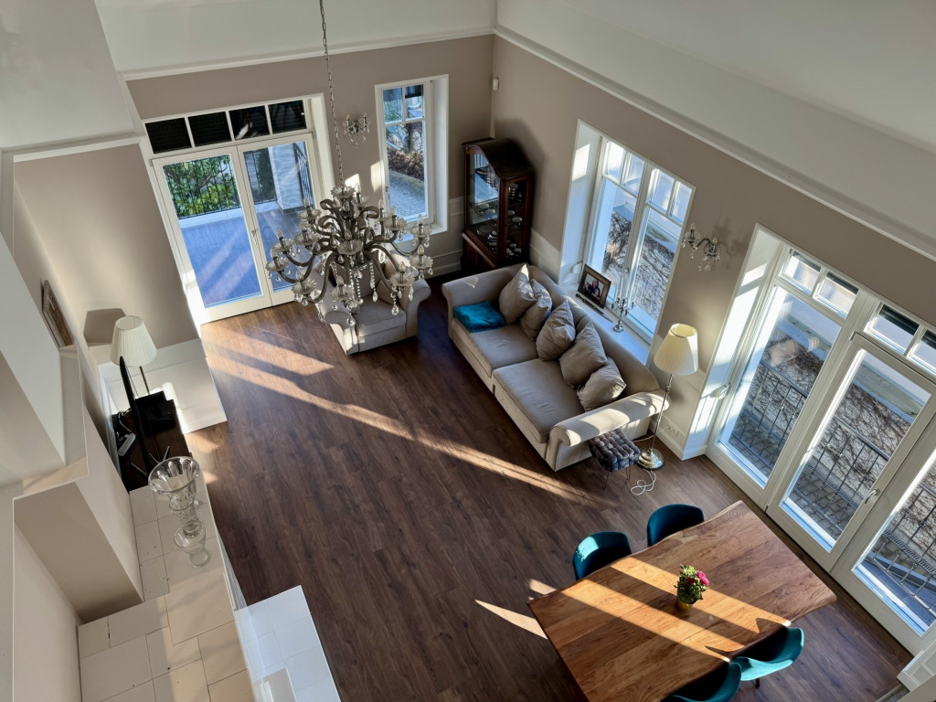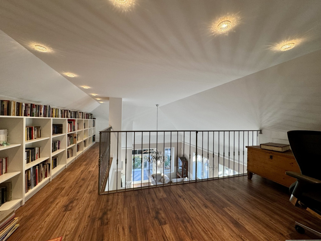 Amerikai konyhás, előkelő galériás nappali, ahol megtalálható egy pazar cserépkályha.
