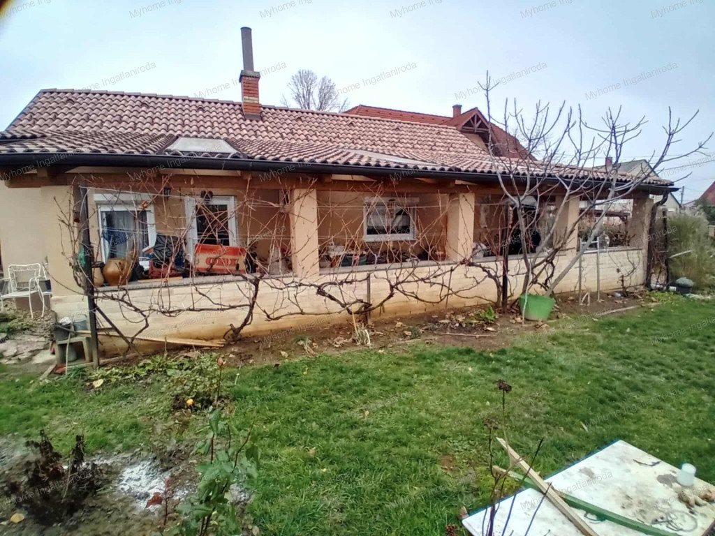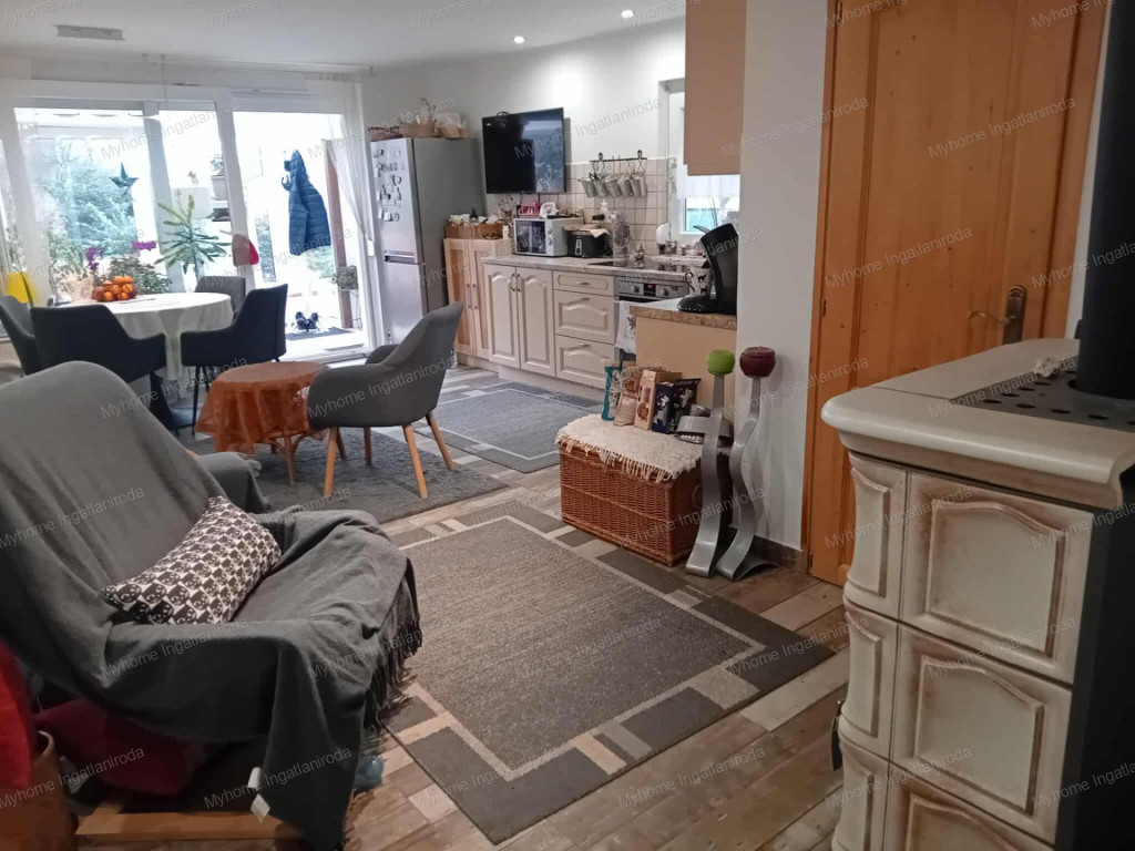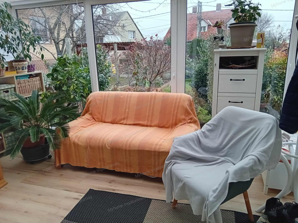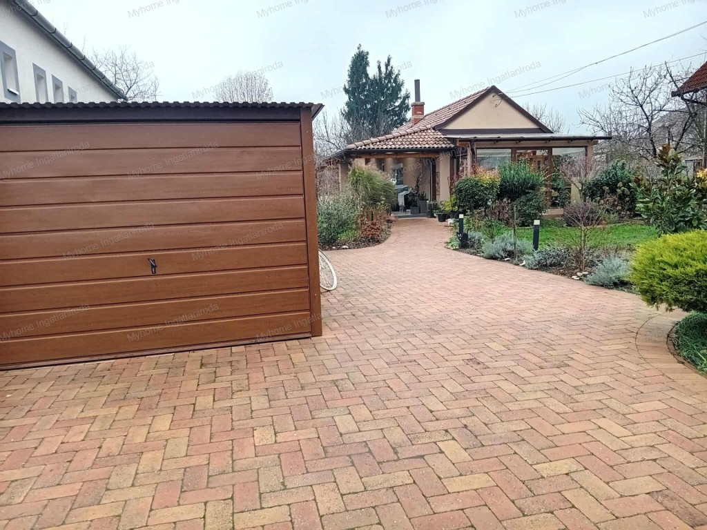A ház 60 nm ( nappali- amerikai konyha, hálószoba, fürdő-wc, télikert) . A fűtött téikertben infraszauna került elhelyezésre. A ház belső oldalán tágas fedett terasz, az udvaron garázs és szerszámtároló található. Fűtése részben padlófűtés ( télikert, háló) részben klíma és cserépkályha ( nappali, fürdő). Gázcsonk a telken belül van. A ház 10 cm vastag szigetelésének is köszönhetően barátságos rezsivel bír. A széles utcafrontú telek egyrész esztétikus térkövezést kapott, a fennmaradó rész parkosított és gyümölcsfákkal beültetett.
